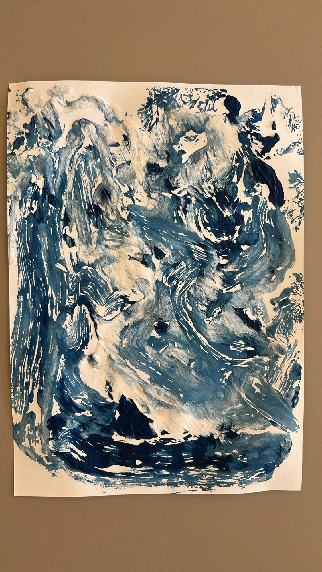 Bērna radošs darbs nospiedumtehnikā - tika piedāvātas 3 krāsas (tumši zila, gaiši zila, balta), ota un paliknis. Bērns ar otu jauc krāsas uz palikņa, vēlāk uzliek lapu un piespiež ar plausktu - rezultātā ļoti skaists mākslas darbs.