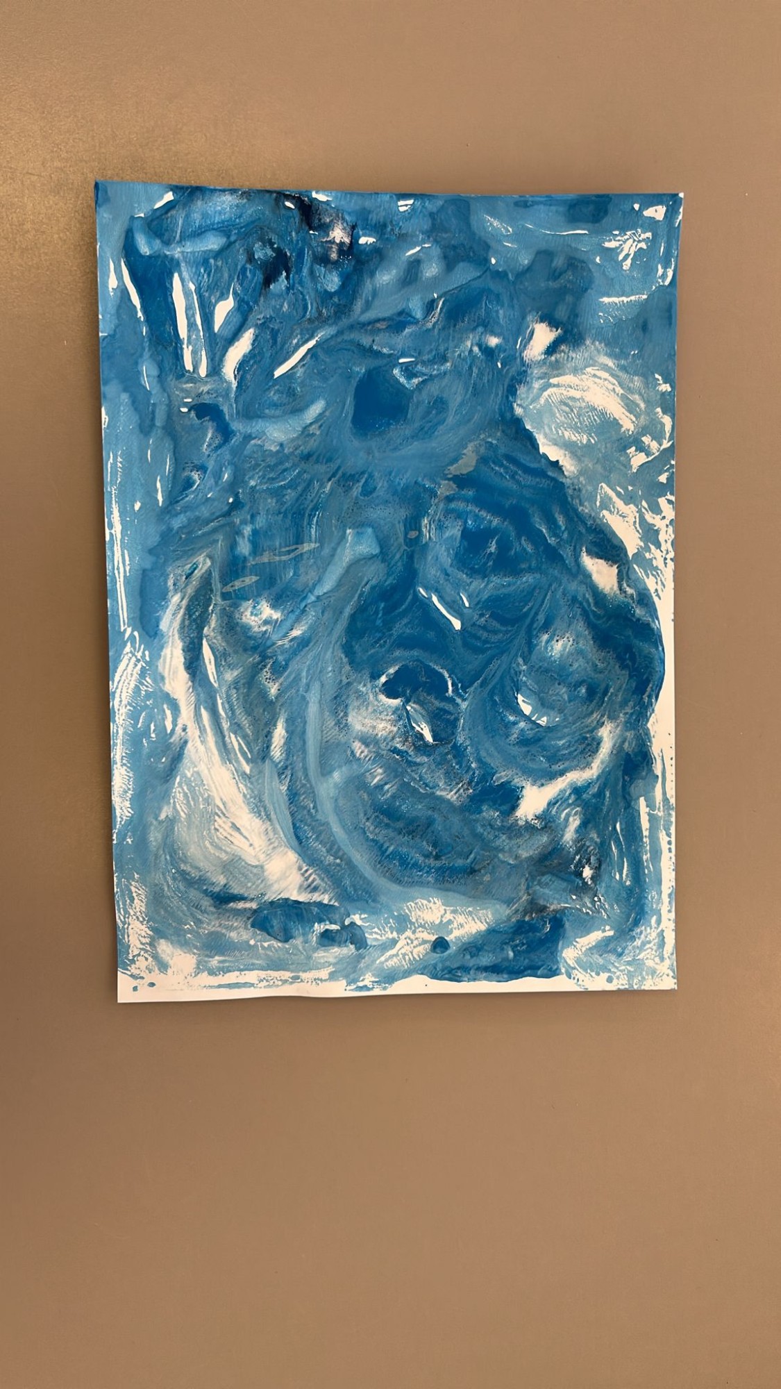 Bērna radošs darbs nospiedumtehnikā - tika piedāvātas 3 krāsas (tumši zila, gaiši zila, balta), ota un paliknis. Bērns ar otu jauc krāsas uz palikņa, vēlāk uzliek lapu un piespiež ar plausktu - rezultātā ļoti skaists mākslas darbs.