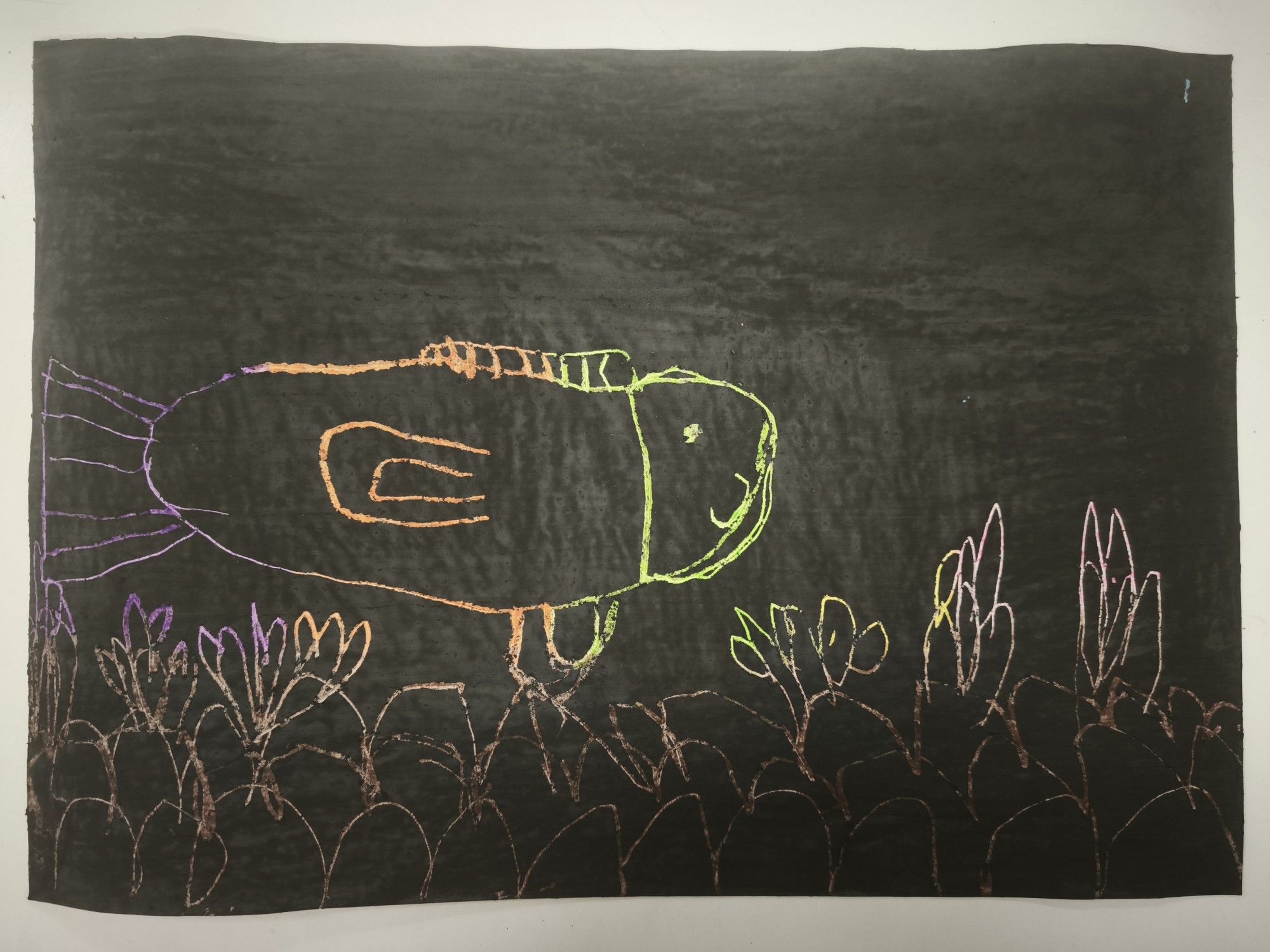 Bērns vispirms zīmēja skici, uz cita papīra krāsoja ar krītiņiem pamatu, noklāja to ar krāsu. Kad krāsa nožuva, realizēja savu skici izskrāpejot.