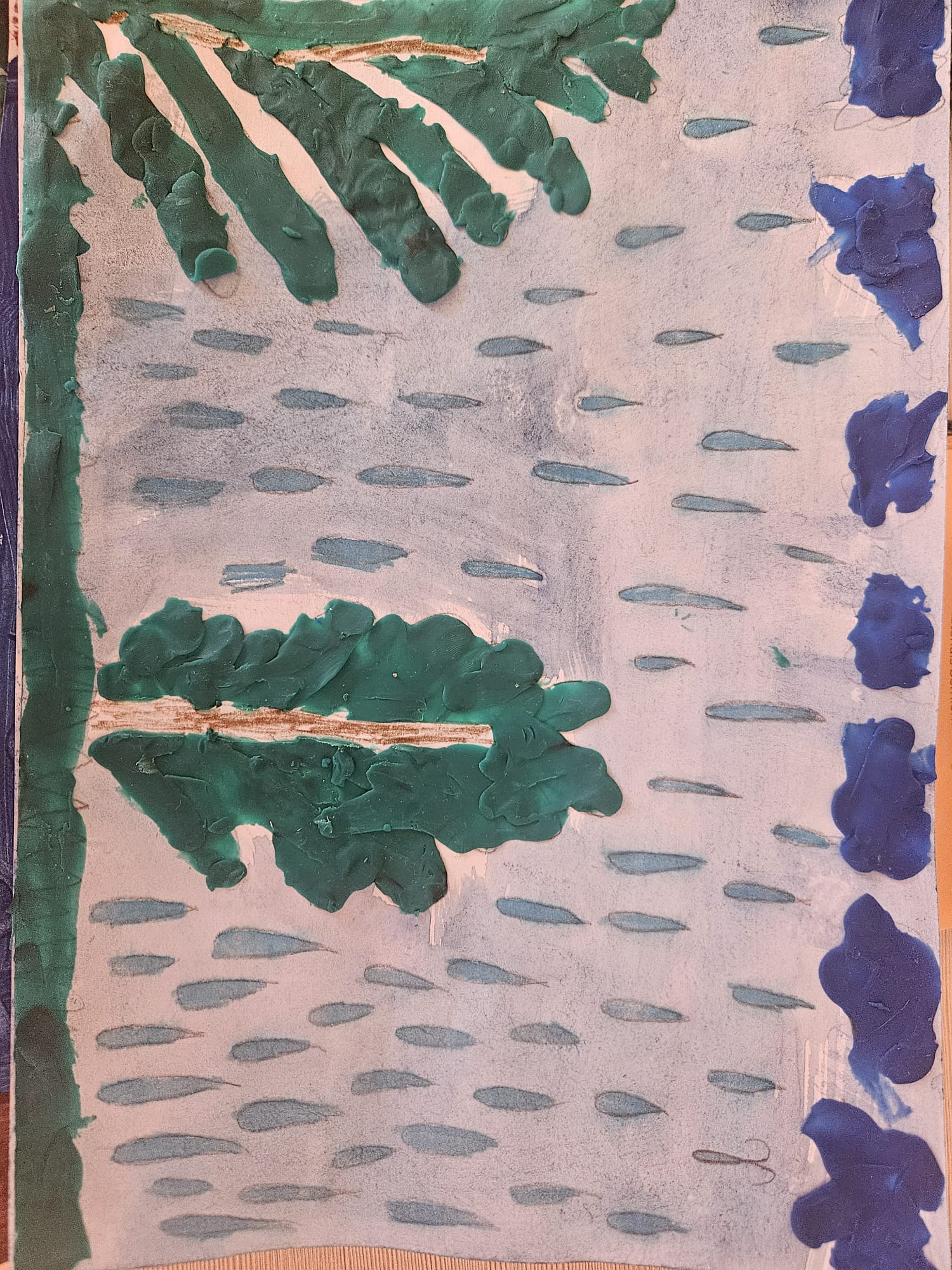 "Manā zīmējumā redzams lietus mežā. No mākoņiem krīt lietus lāses, kas dod ūdeni kokiem un augiem. Lietus palīdz dabai augt un palikt zaļai un dzīvai. Ar šo zīmējumu es gribēju parādīt, cik svarīgs dabai ir ūdens."