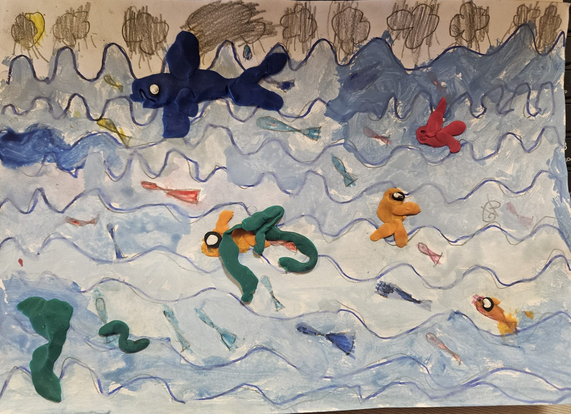 "Es uztaisīju akvāriju ar daudzām zivtiņām. Tās visas dzīvo ūdenī, un bez ūdens viņas nevarētu elpot un peldēt. Es pielīmēju krāsainos tēliņus, lai izskatās, ka viņi kustas un spēlējas ūdenī. Ūdens ir ļoti svarīgs, jo tas ir viņu mājas un tur viņas jūtas droši. Man patīk, ka akvārijā viss ir dzīvs un kustīgs."