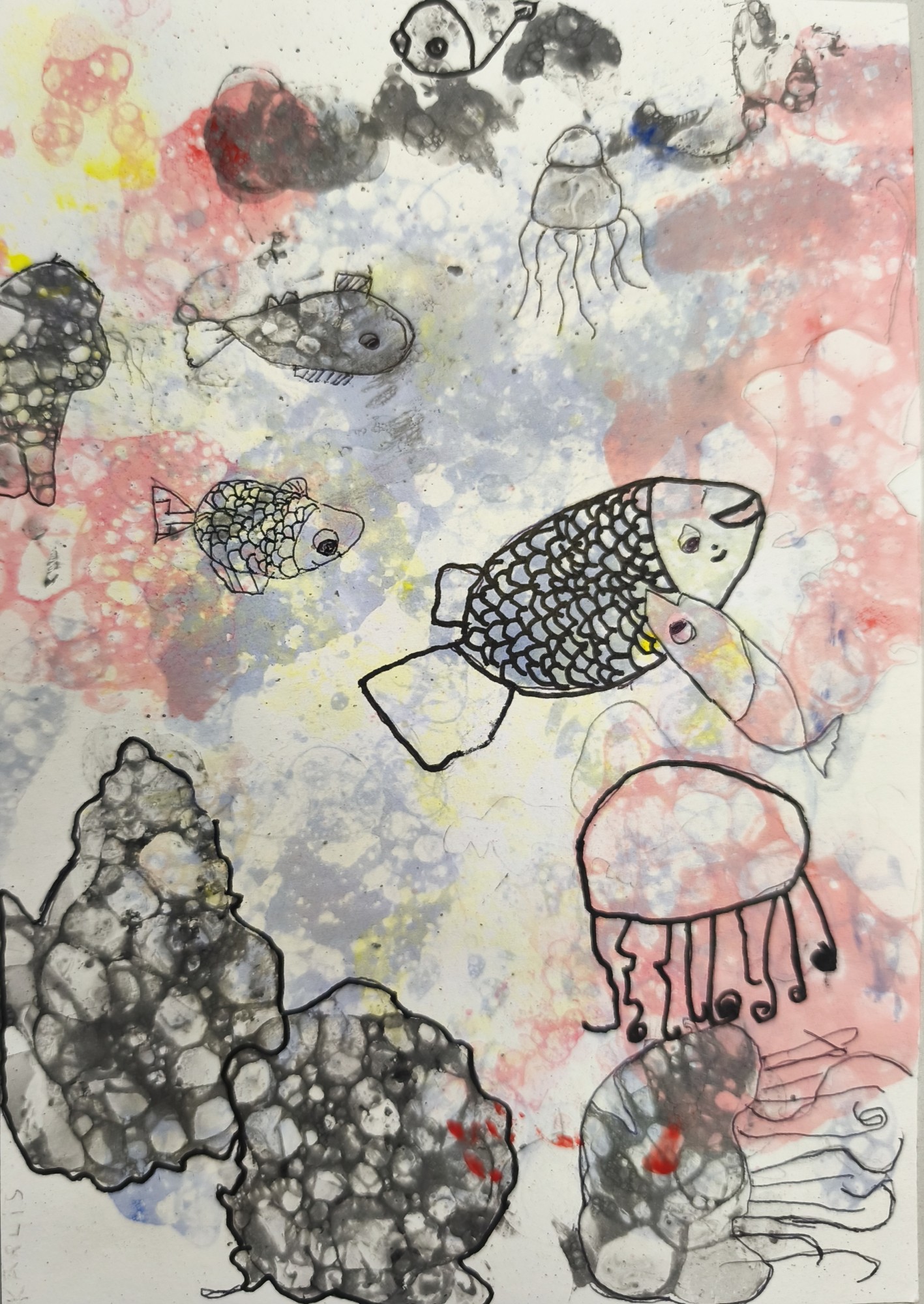 Darbs veidots pūšot guašas / Fairy burbuļus, papildinot ar grafisku zīmējumu.