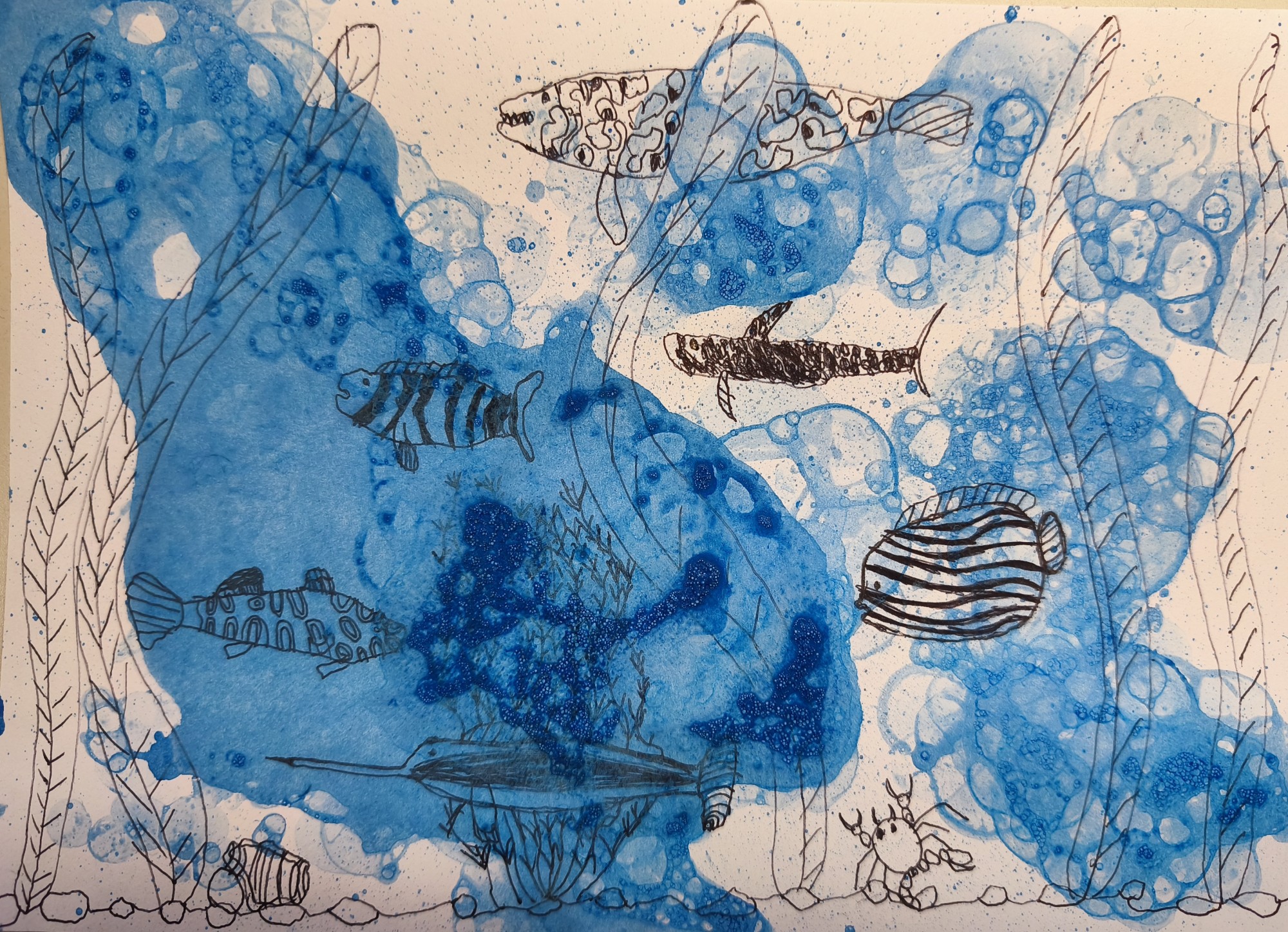 Darbs veidots pūšot guašas / Fairy burbuļus, papildinot ar grafisku zīmējumu.