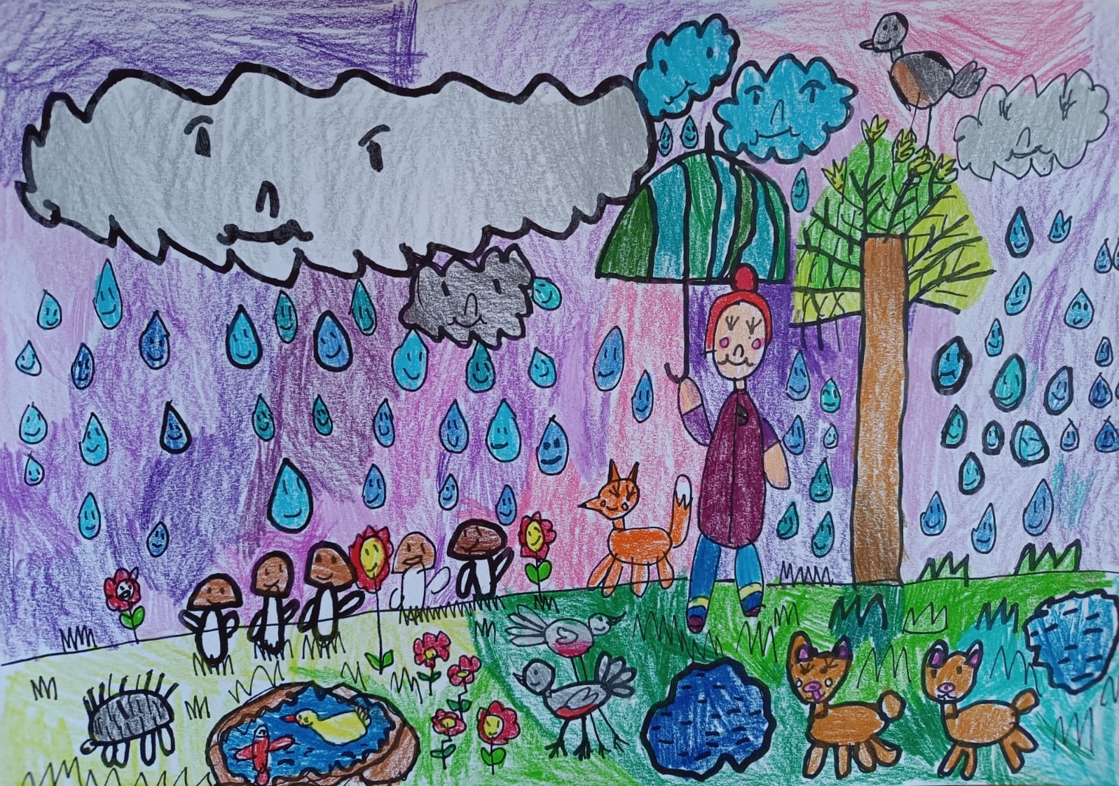Lietus uzlīst pīlei uz knābja, zivij uz astes, ezim uz adatām. Pēc lietutiņa viss apkārt smaržo, zaļo un atžirgst.