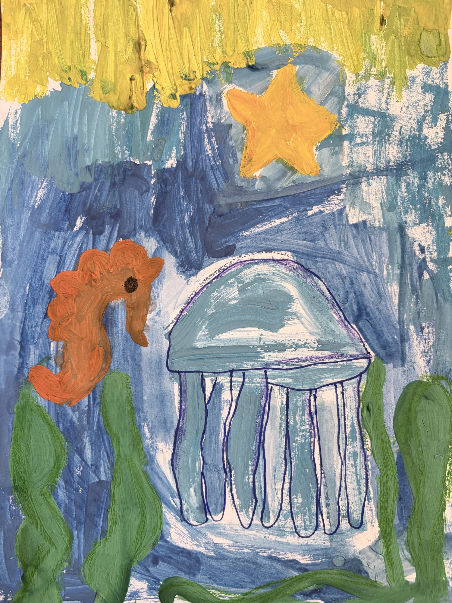 Zem ūdens es varu satikt jūras zvaigzni, medūzu un jūras zirdziņu. Vēl tur ir ūdenszāles spilgti zaļā krāsā.