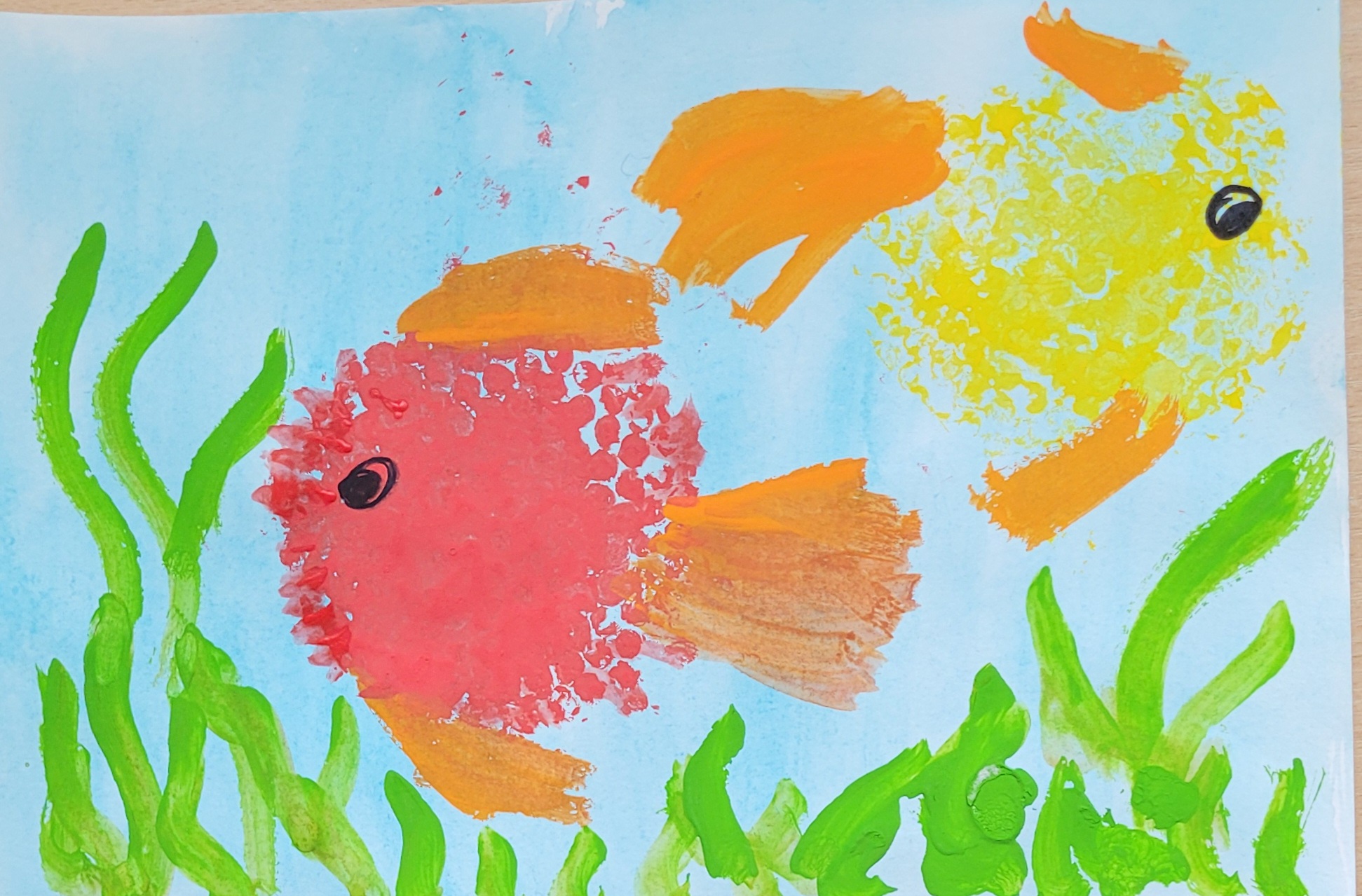 Zīmējums ir izpildīts netradicionālā tehnikā, izmantojot burbuļplēvi un guaša krāsas.