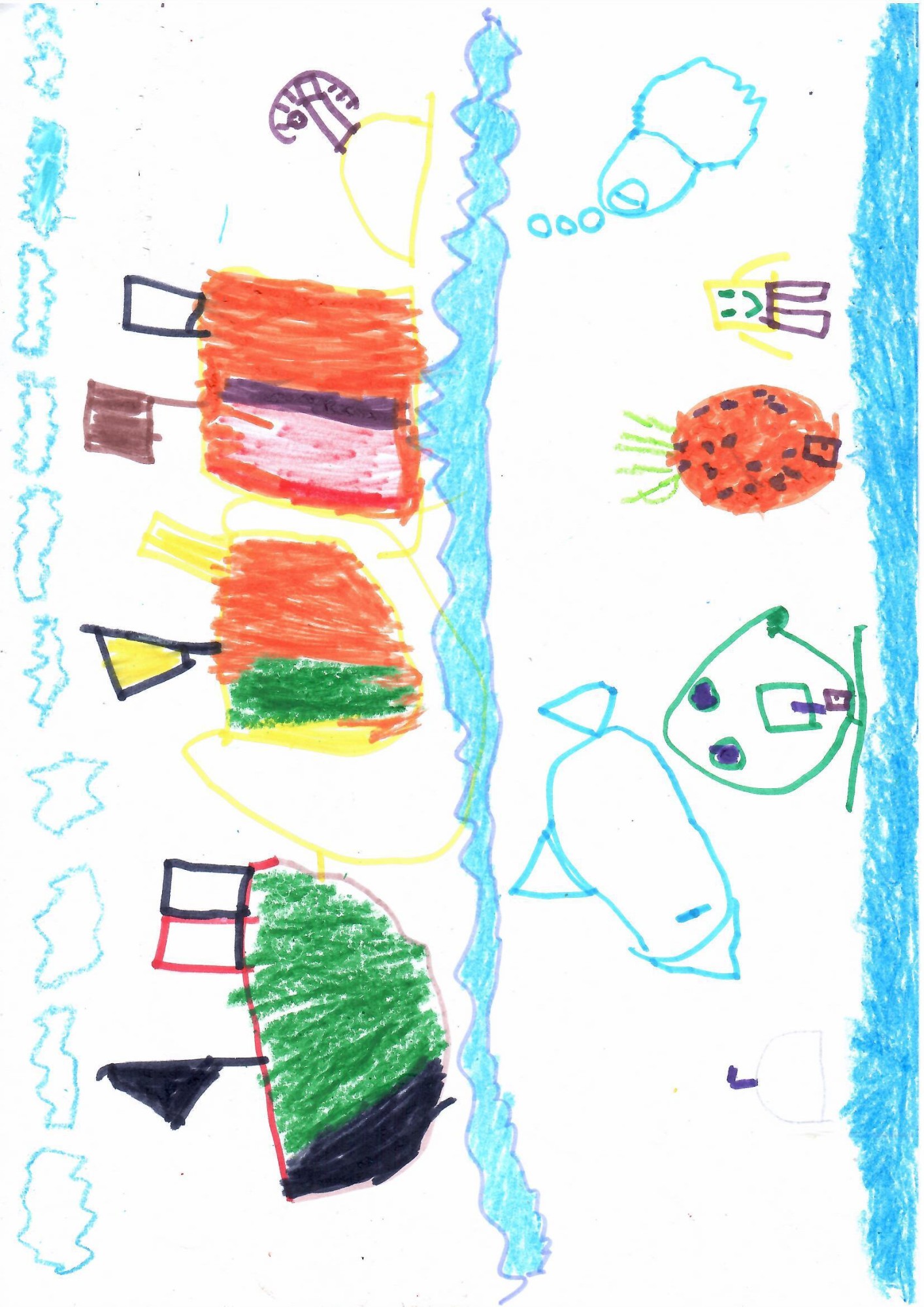 Kuģi peld pa ūdeni, zivis un Spandž Bobs dzīvo ūdenī.