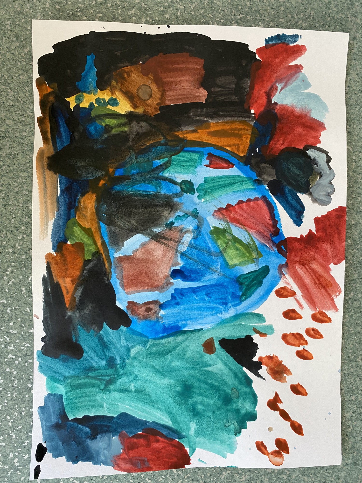 Globuss ar dūmiem. Tā zaļā ir pasaule, debesīs ir brūni mākoņi, apakšā uguns.