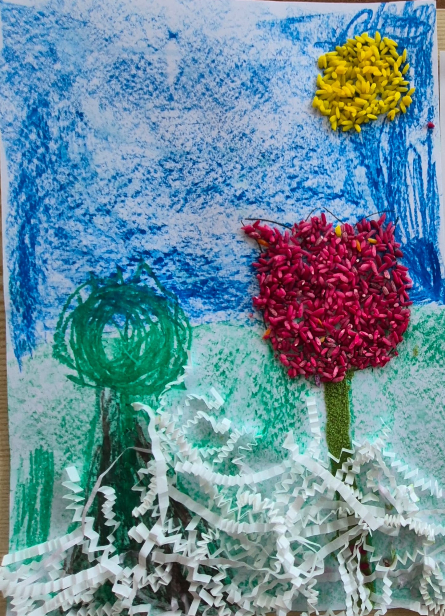 Attēlots ir zieds, ar koku, sniegu un ūdeni saulainā dienā – spožā saule kausē sniegu, radot dzīvīgu un gaismas pilnu ainavu, kas simbolizē pavasara atmodu un dabas spēku.