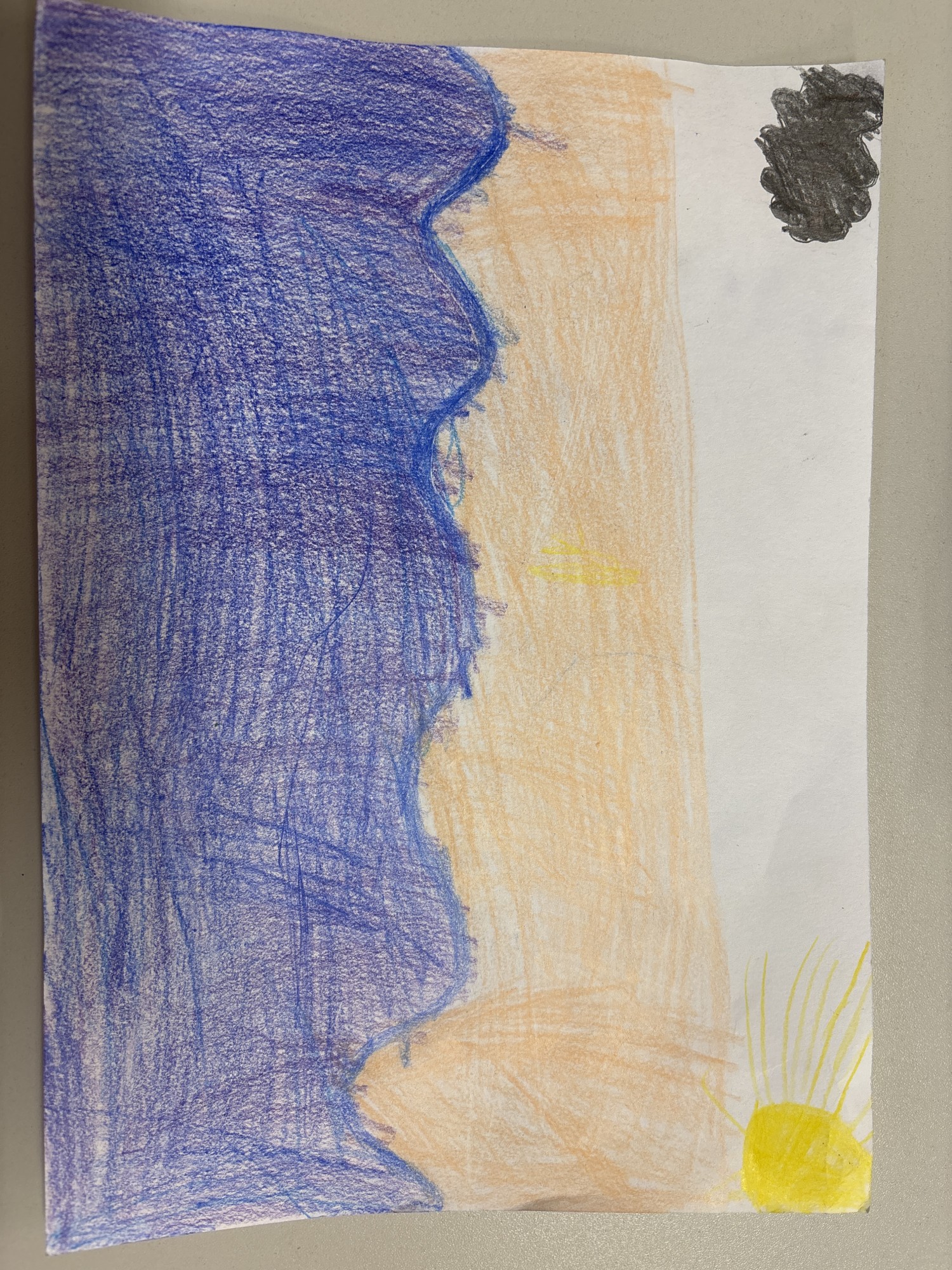 Es uzzīmēju sauli, mākoni, jūru un smiltis.