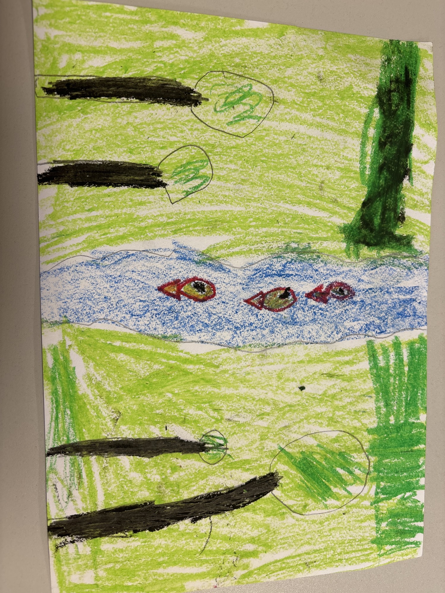 Mežā tek upe un tajā peld zivis.