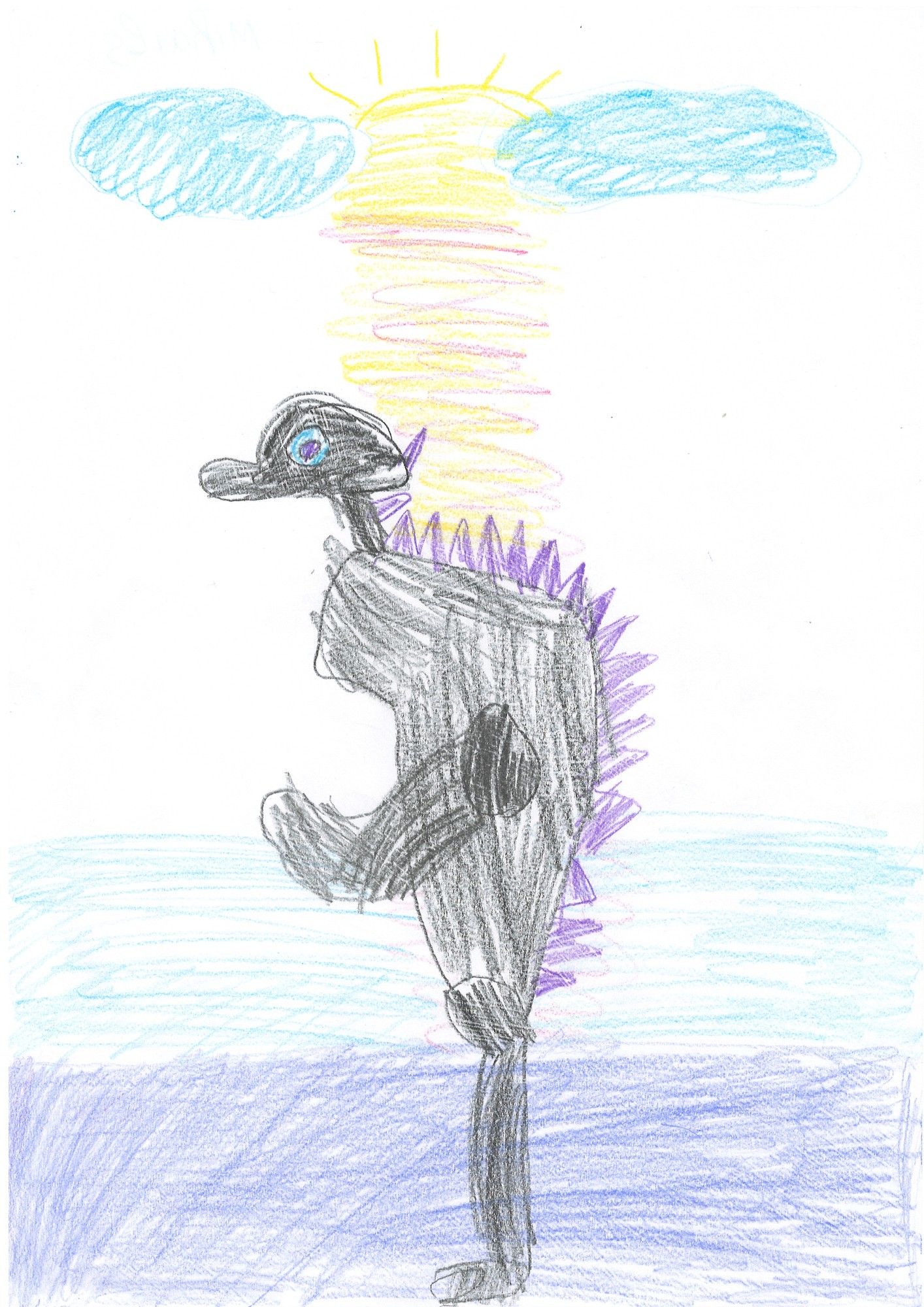 Mihailam patīk dinozauri. Viņš uzzīmēja savu mīļāko un stiprāko no dinozauriem - Godzillu, kura dzīvo jūras dzelmē. Šajā darbā autors attēlota Godzillas pacelšanos no jūras dzelmes un iznākšanu no jūras, lai pasildītos un pabaudītu siltos vasaras saules starus