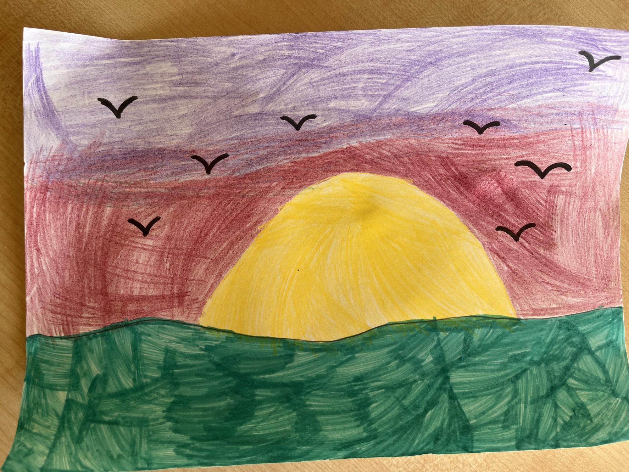 Saule lēnām riet jūras krastā. Debesis kļūst sarkanas un lillā. Jūra spīd zaļganzila. Tas ir ļoti skaists un mierīgs vakars.