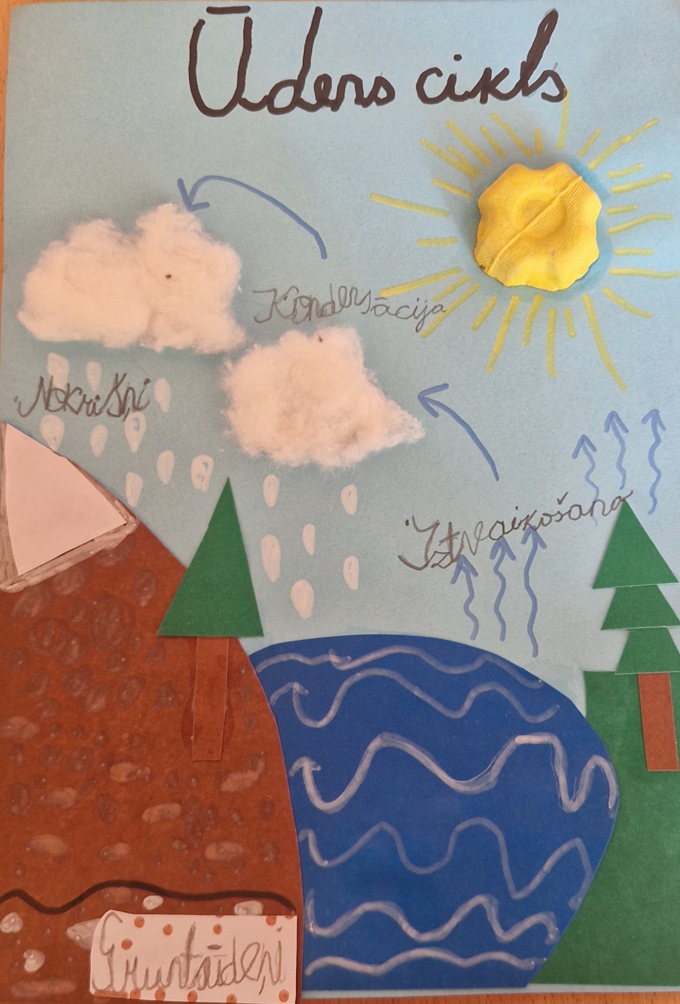 Bērna teiktais par savu darbu: Viss sākās ar mākoņiem - krīt sniegs vai ūdens līdz gruntsūdeņiem un tad tas ietek jūrā vai upē un tad nonāk pie augiem un tie iztvaiko ūdeni un tālāk nonāk mākoņos un riņķo.