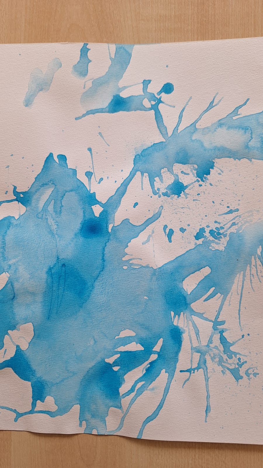 Vispirms bērni ūdenī iejauca zilo krāsu, ar pipeti pilināja pilītes uz a4 formāta lapas. Kad pilītes sapilinātas, ar salmiņu izpūta pa visu lapu.