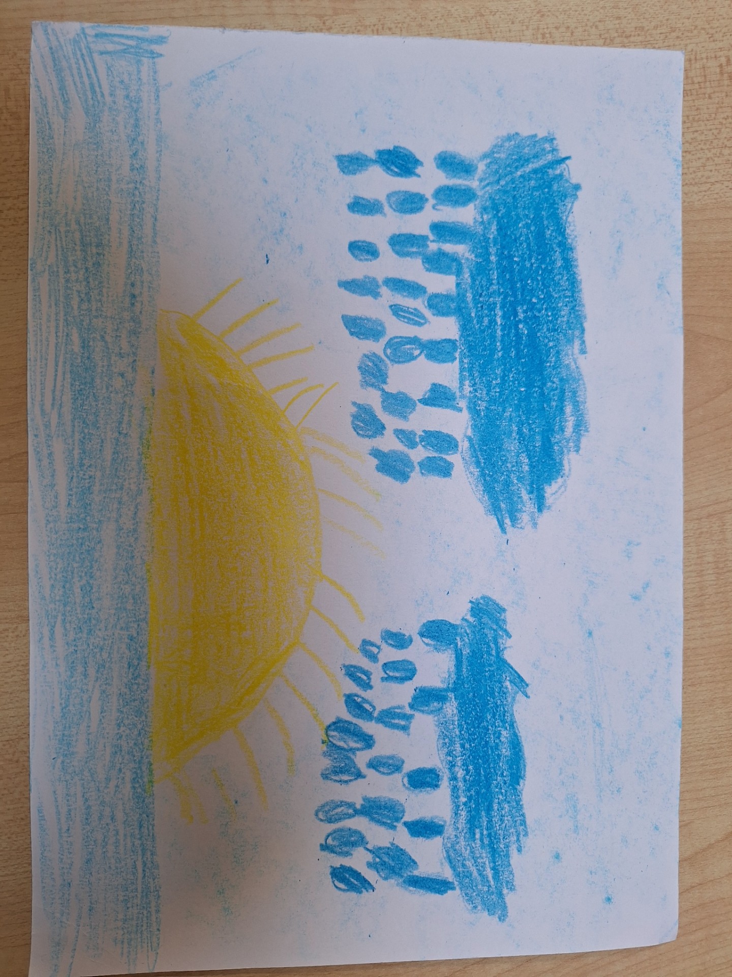 Zīmējums parāda dabas dažādību un skaistumu. Debesīs redzami mākoņi, no kuriem līst lietus, tajā pašā laikā spīd spoža saule.