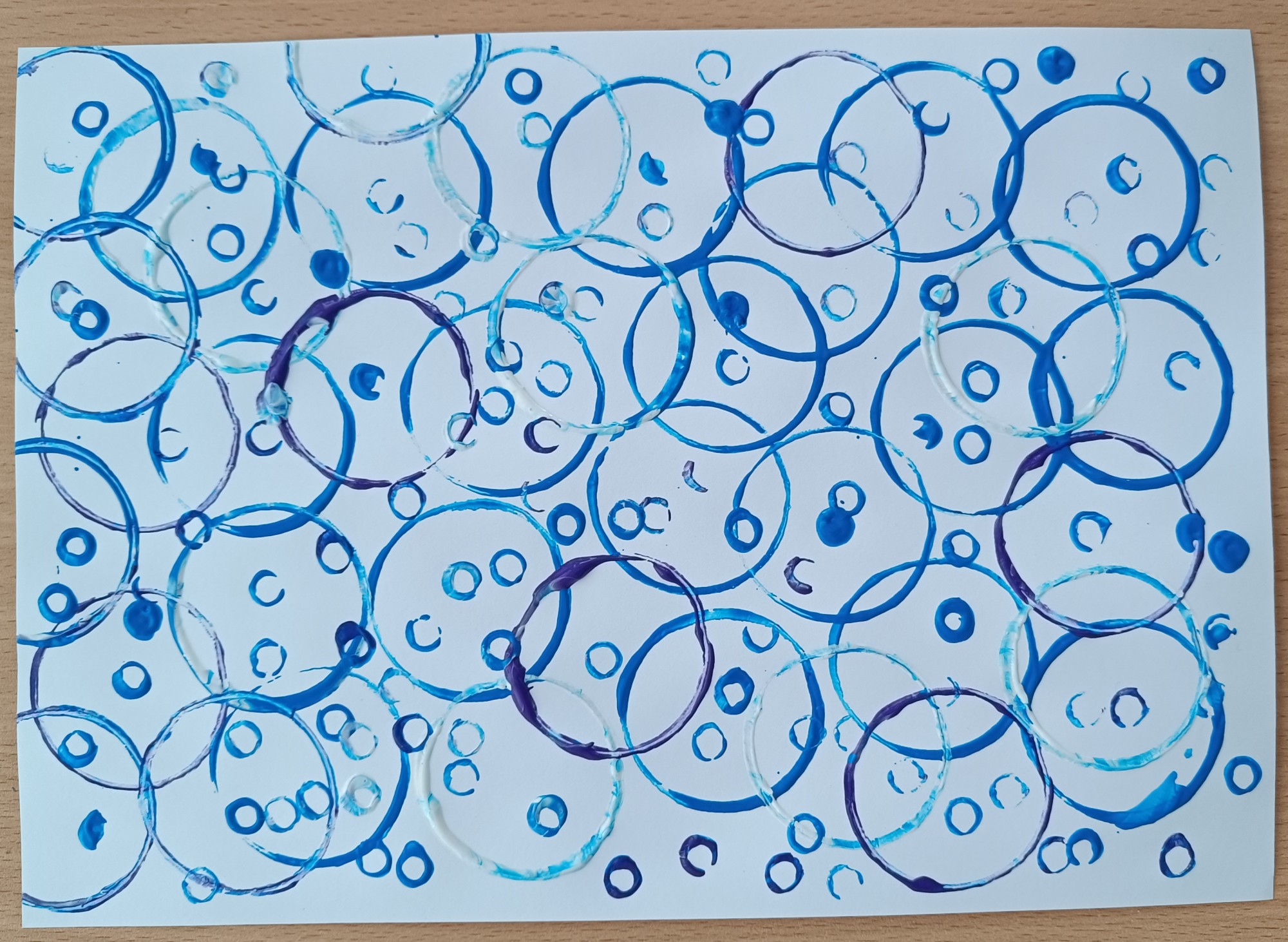 Darba autori ir 2 gadu veci bērni. Zimējumā tika izmantotas guaša krāsas, tualetes papīra ruļļi un salmiņi nospiedumu veidošanai.