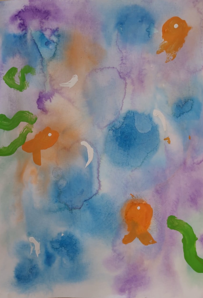 Bērns zīmējis krāsainu akvāriju ar zivtiņām un ūdens augiem. Zīmējot bērns attīsta roku veiklību un iztēli.