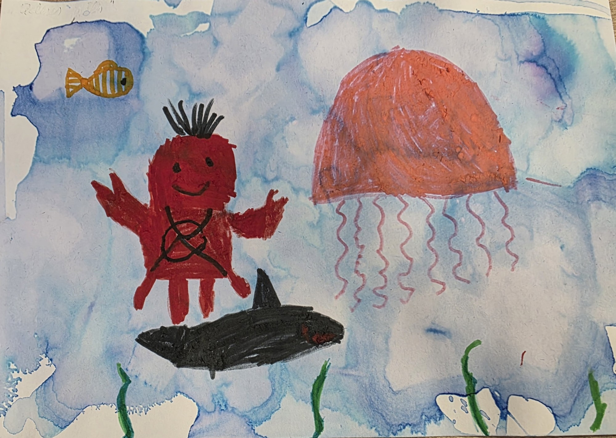 Medūza ar krabi cīnās, mazā zivtiņa ir tiesnesis. Haizivs visu novēro.