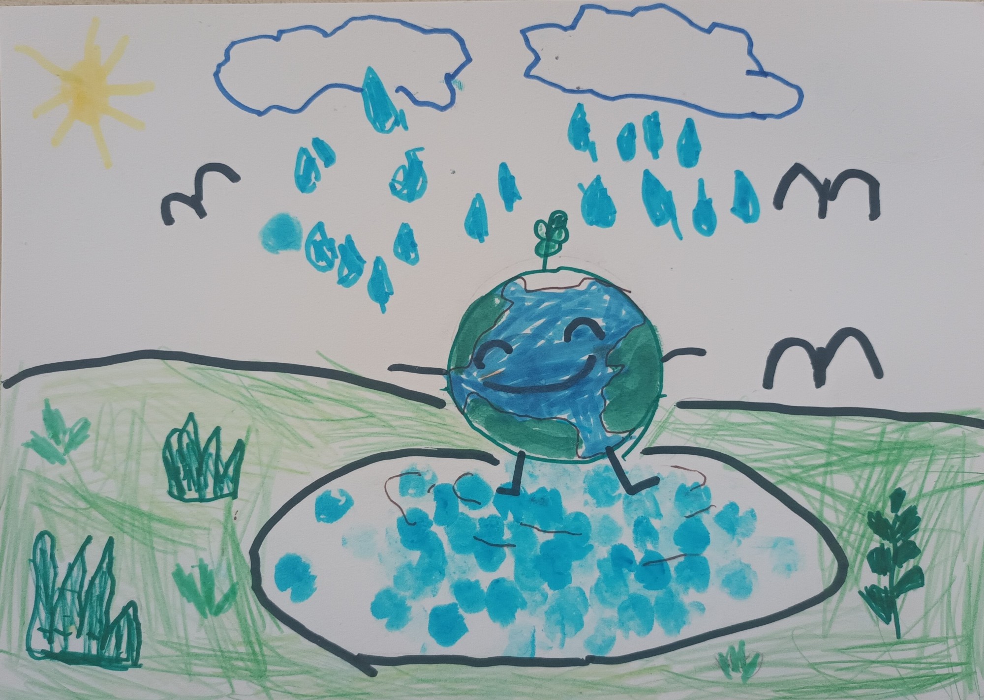 Te ir Zeme, kas smaida un ir priecīga. No mākoņiem krīt lietus, un Zemei tas patīk. Augšā spīd saule un lido putniņi. Apkārt aug zālīte un augi. Zeme stāv ūdenī un priecājas, ka viss ir zaļš un dzīvs.