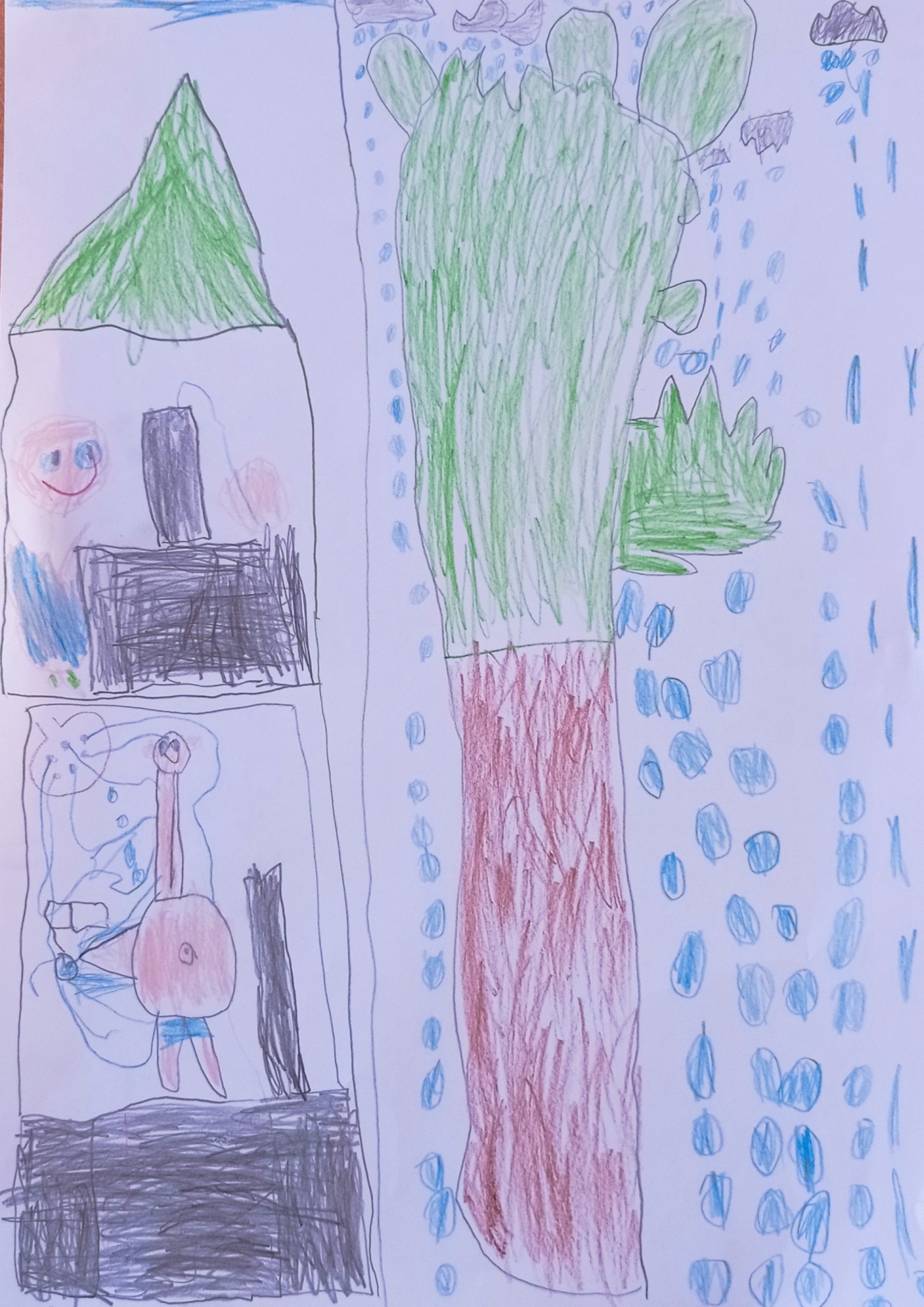 Tētis pirmajā stāvā iet dušā. Otrajā stāvā mamma pie datora strādājot padzeras. Pie mājas aug koks, kuru šobrīd aplaista lietus.