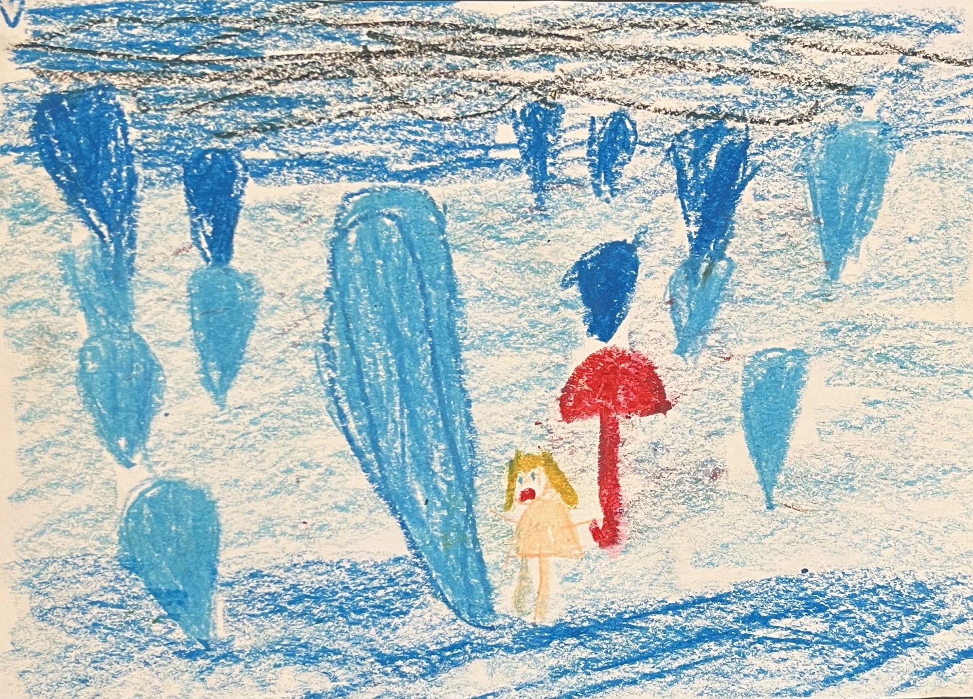 Līst ļoti daudz lietus, meitenei priekšā peļķe. Lietus līst ilgi un ir melni mākoņi
