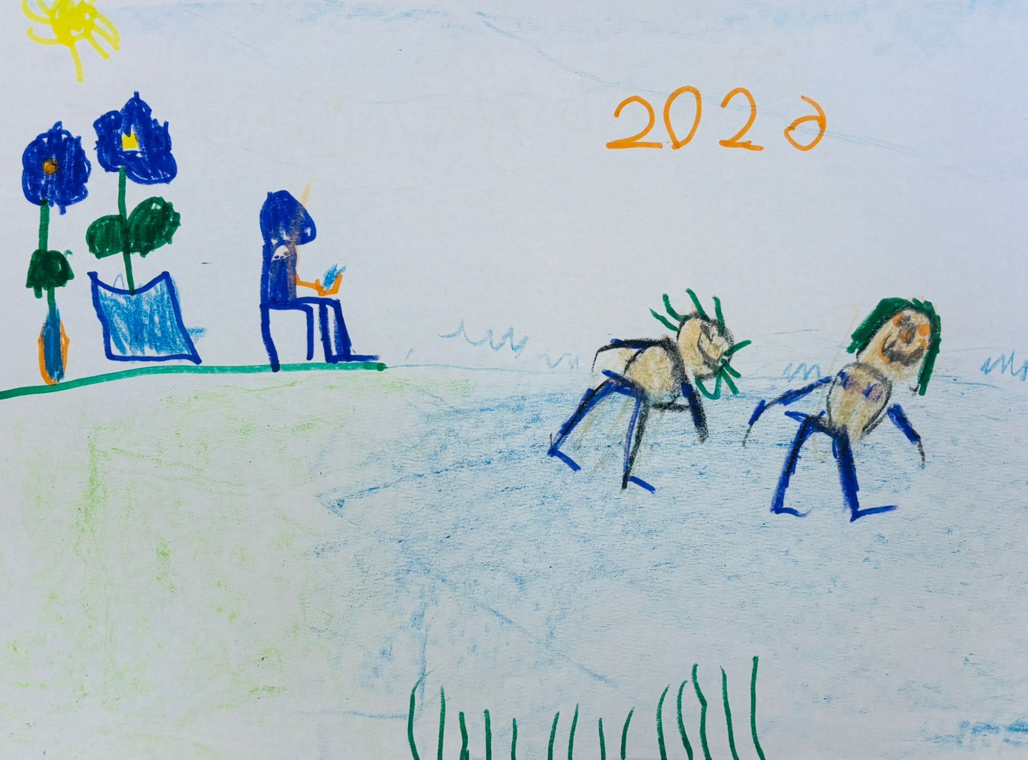 Es sēžu uz krēsla un dzeru ūdeni. Mamma un tētis peld. Puķēm vajag ūdeni, lai augtu.