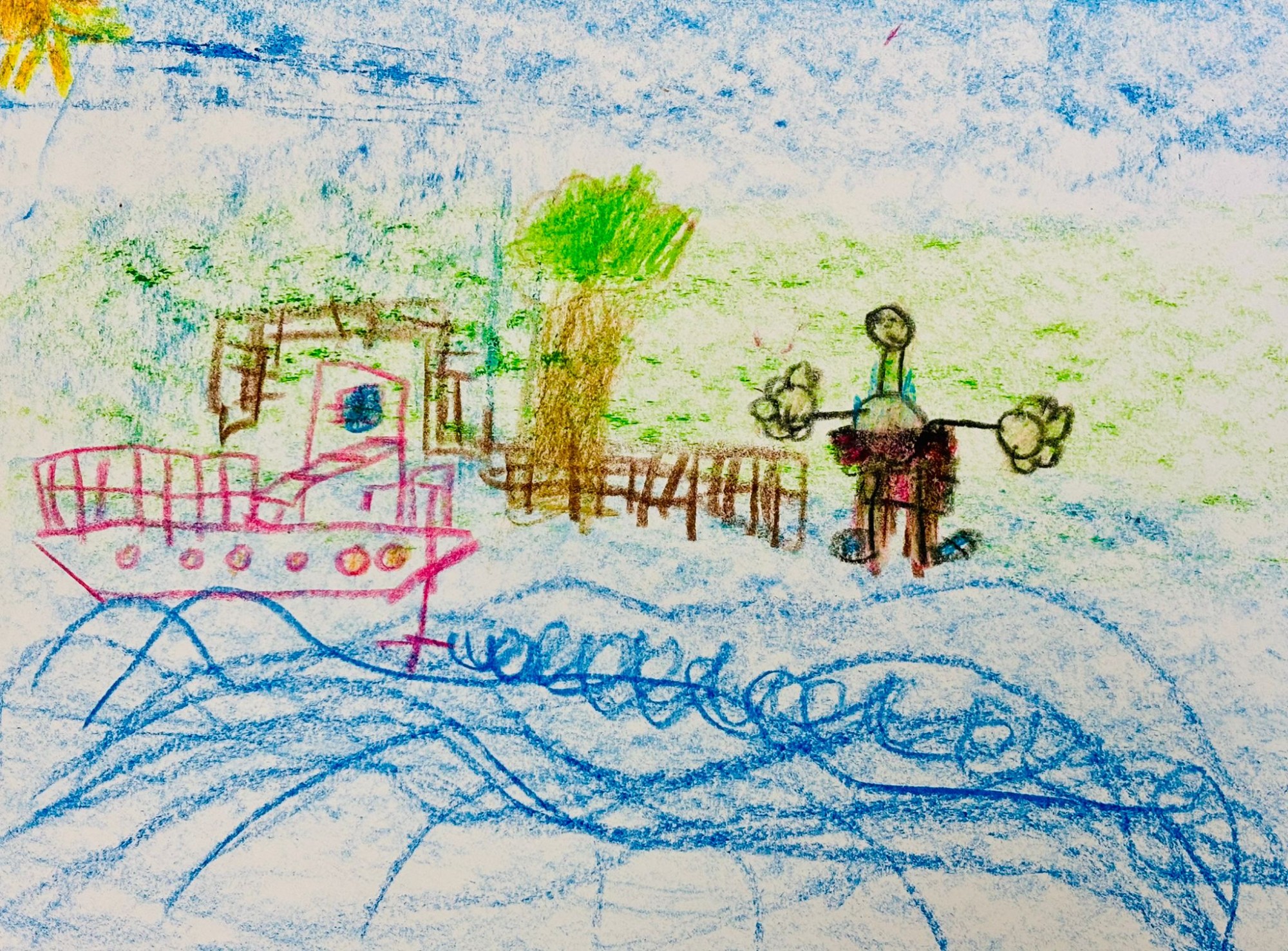 Es uzzīmēju, ko es daru ar ūdeni. Es ar ātrlaivu braucu pa ūdeni. Man patīk peldēt.