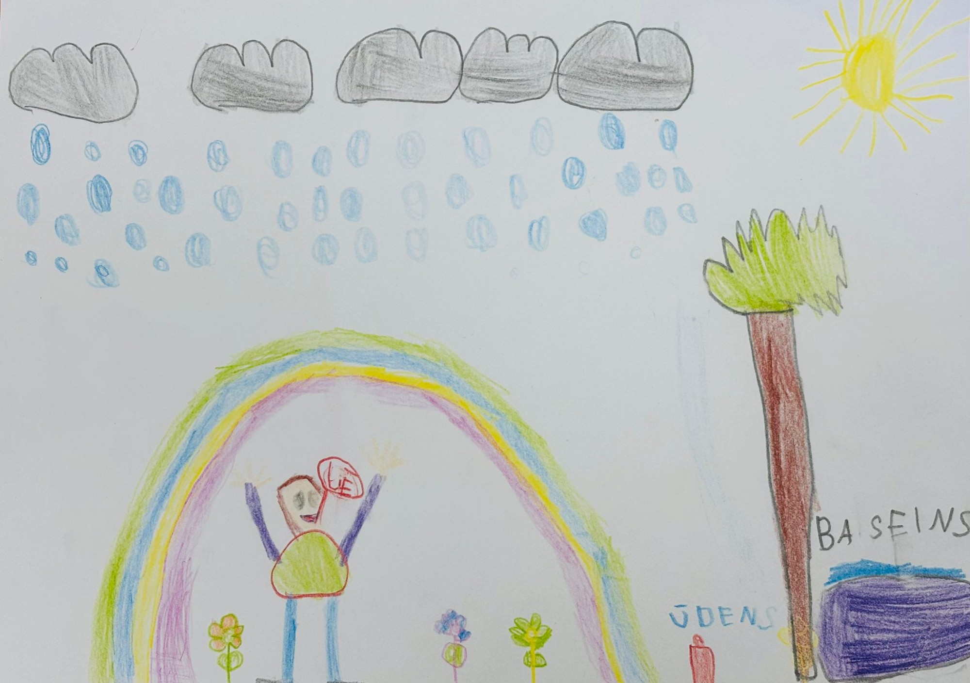 Es uzzīmēju lietu, lietus ir ūdens. Es uzzīmēju sauli, jo saule un lietus izveido varavīksni. Kokam vajag ūdeni, lai augtu.