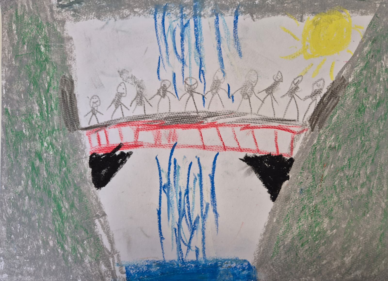 Es uzzīmēju tiltu virs ūdens un daudz cilvēkus, kuri turas rokās. Viņi kopā palīdz cits citam. Zem tilta krīt ūdens no augsta ūdenskrituma, bet darugi kopā jūtas drošībā.