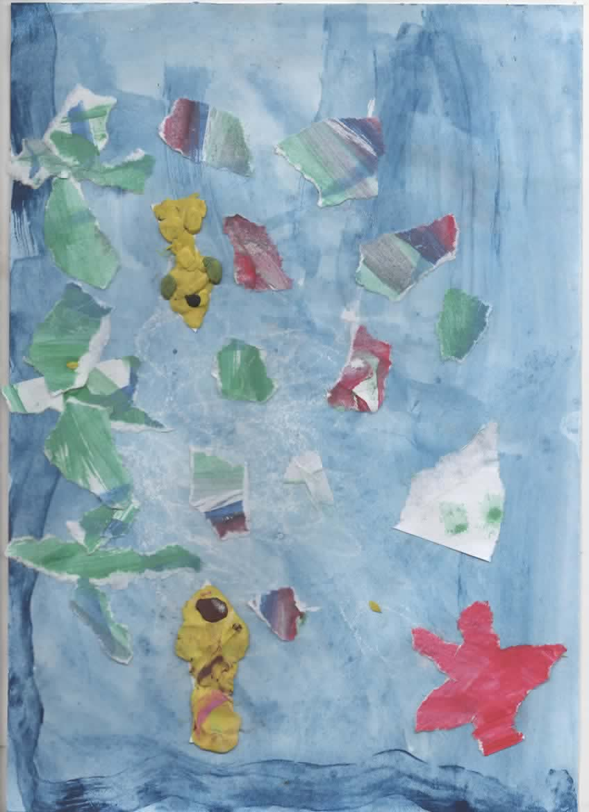 Darba lapas kuras tika izmantotas šajā darbā un fons tika noklāts ar guaša krāsu, no papīra tika izplēsti jūras augi un zivs tika veidoti no plastilīna.
