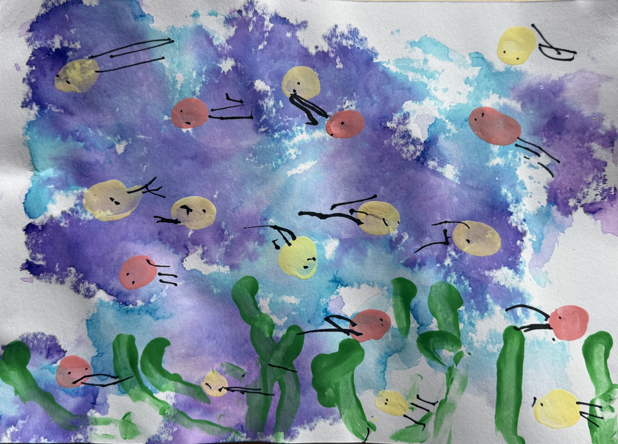 Fons, jeb ūdens veidots ar ūdeni un kreppapīra plēsto gabaliņu nospiedumiem, kas iekrāsojas, bet zivtiņas -ar pirkstu krāsas nospiedumiem