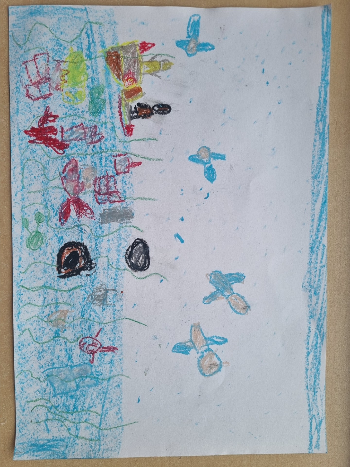 Cilvēki tīra ūdeni no atkritumiem, lai zivīm būtu tīrs ūdens.