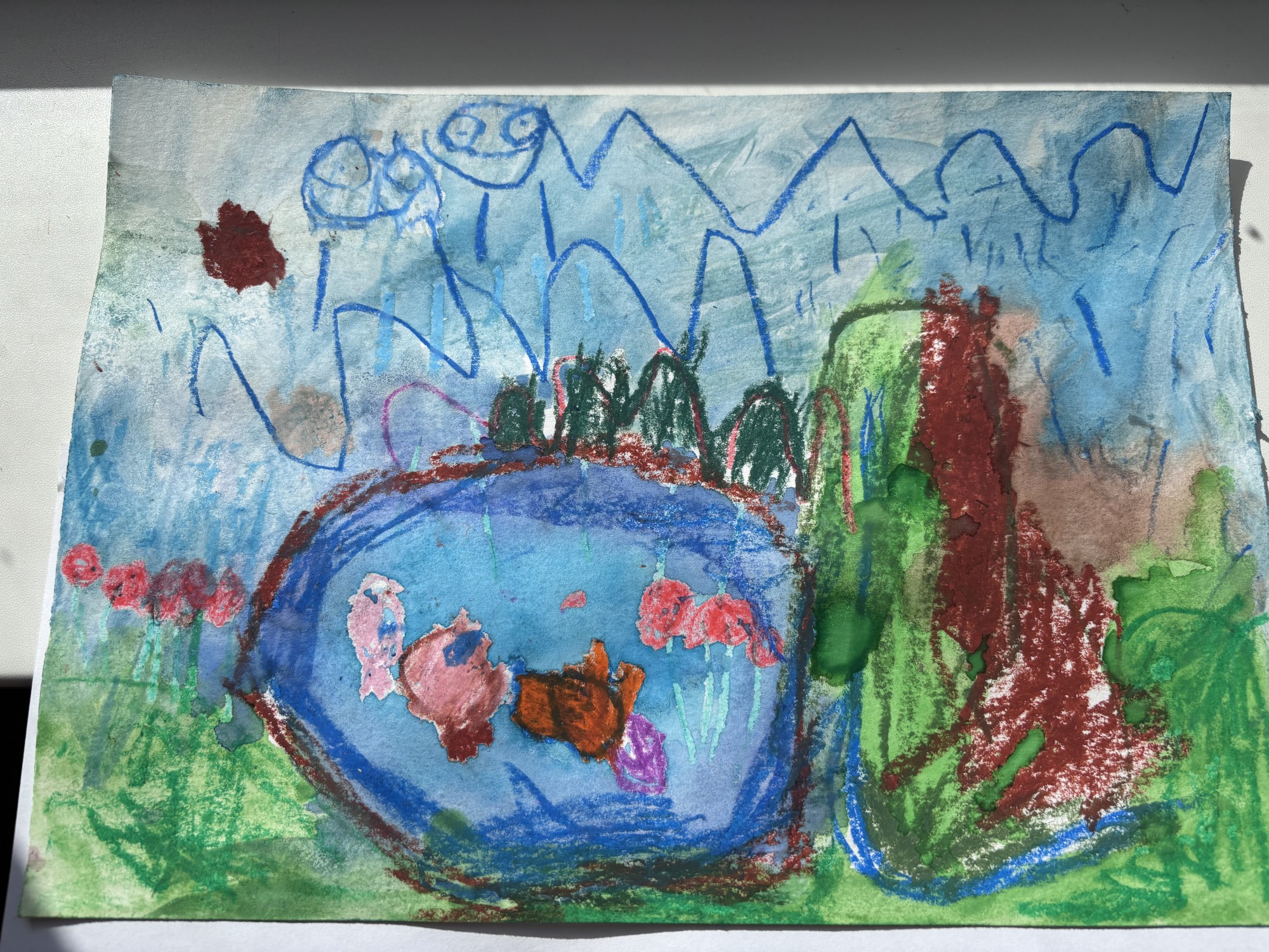 No mākoņiem līst lietus, viņi ir priecīgi, lietus patīk puķēm un zālei, ūdenī peld zivis, no kalna tek ūdens.