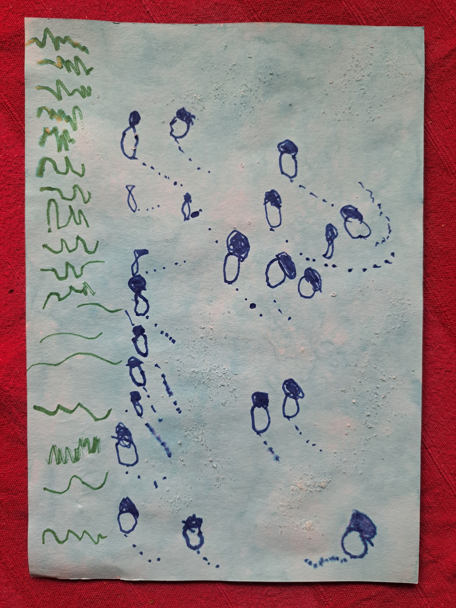 Zīmējums tapis iemērcot zilu kreppapīru ūdenī. Slapjais kreppapīrs notonēja zilu lapu, kurš bija kā okeāns. Uzbērts sāls un ar flomasteru uzzīmētas jūraszāles un zivis.