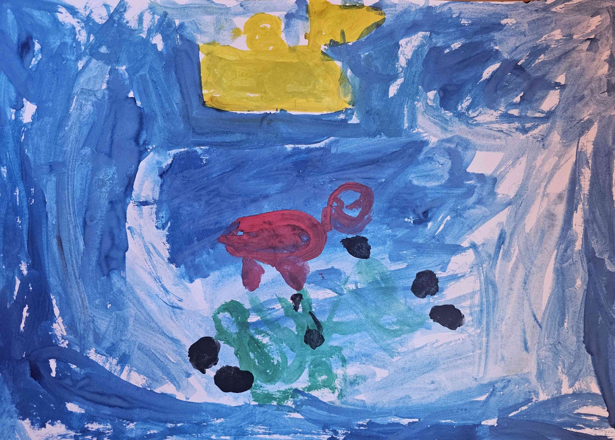 Okeānā ir zivis, nezāles un kuģis.