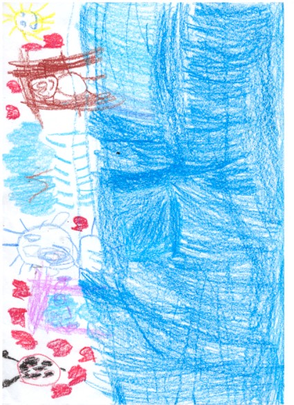 Es uzzīmēju upi, bizmārīti, savu māsu, māmiņu un tēti, lai varētu peldēties cilvēki un bizmārīte dzertu.