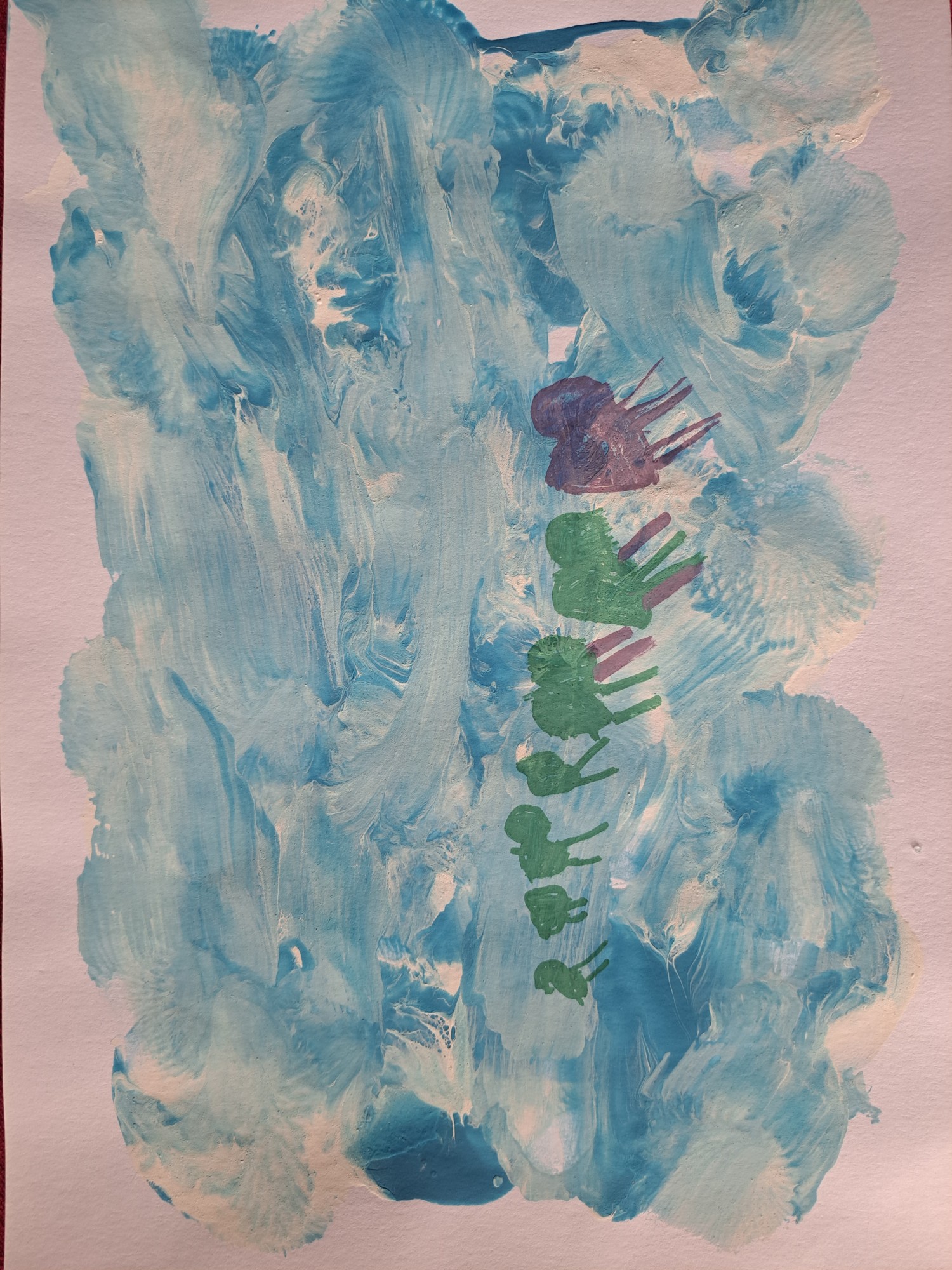 Zīmējums tapis balonu izspaidot pa zilo un balto guašu. Krāsu salikums atgādināja okeānu. Klāt piezīmēti jautrie delfīni ar flomasteru.