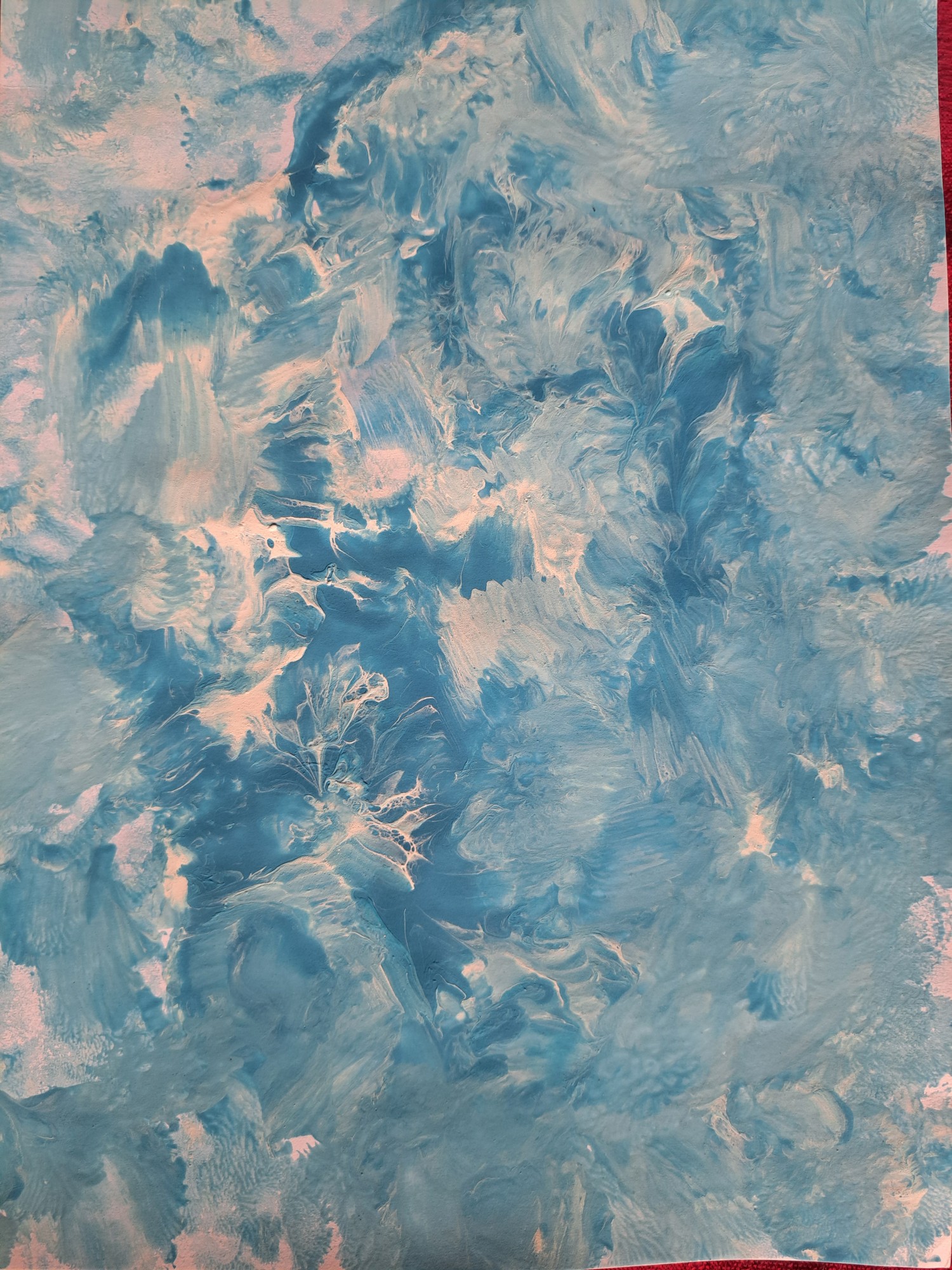 Zīmējums veidojies zilo un balto guašu izspaidot ar piepūstu balonu.
