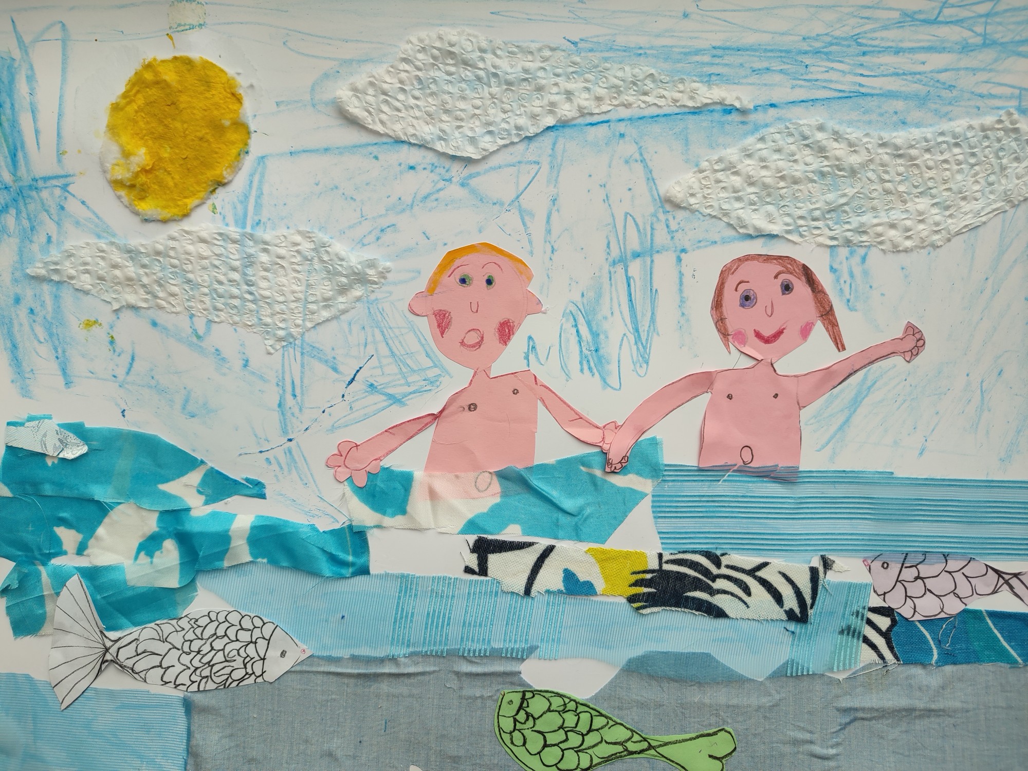 Šajā darbā bērns attēlo ūdeni kā prieka, rotaļu un labsajūtas avotu. Zīmējumā redzama atrašanās ūdenī, kur bērns izjūt prieku, draudzību, brīvību un drošību. Apkārtējie elementi - viļņi, ūdens, dabas motīvi - veido vidi, kur ūdens kļūst par vietu rotaļām un pozitīvām emocijām. Ūdens šeit kļūst ne tikai par ikdienas sastāvdaļu, bet arī par prieka un radošuma avotu.