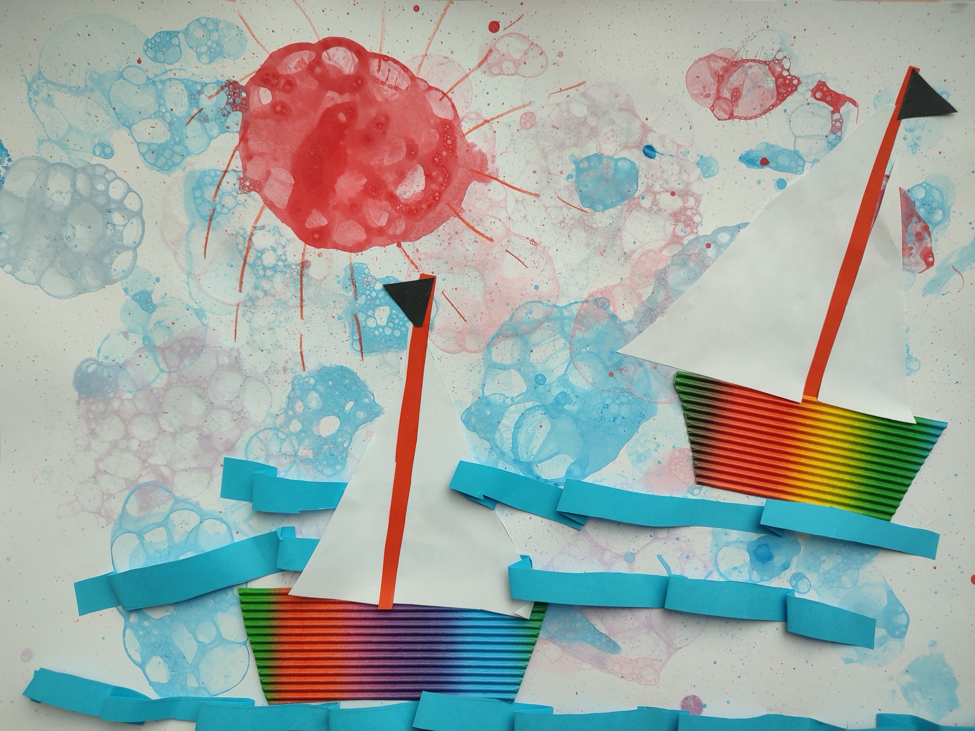 Šajā darbā bērns attēlo ūdeni kā vietu piedzīvojumiem un ceļojumam. Uz ūdens peld laivas, kas virzās pa viļņiem, radot kustības un brīvības sajūtu. Spilgtā saule debesīs izgaismo visu apkārtējo vidi, radot siltuma un drošības sajūtu. Ūdens šeit nav tikai vide, bet arī ceļš, pa kuru iespējams doties nezināmajā un atklāt jaunas vietas.