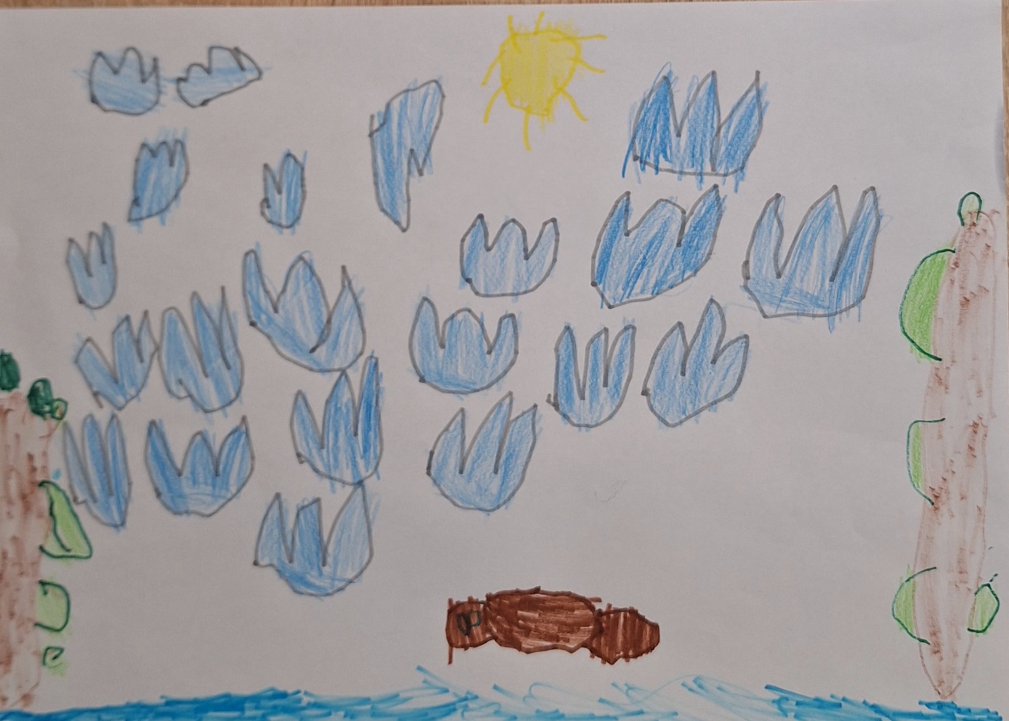 Zīmējums zīmēts ar flomasteriem un zīmuļkrāsām. Zīmējumā attēlota ainava, kur bebrs lec ārā no upes.