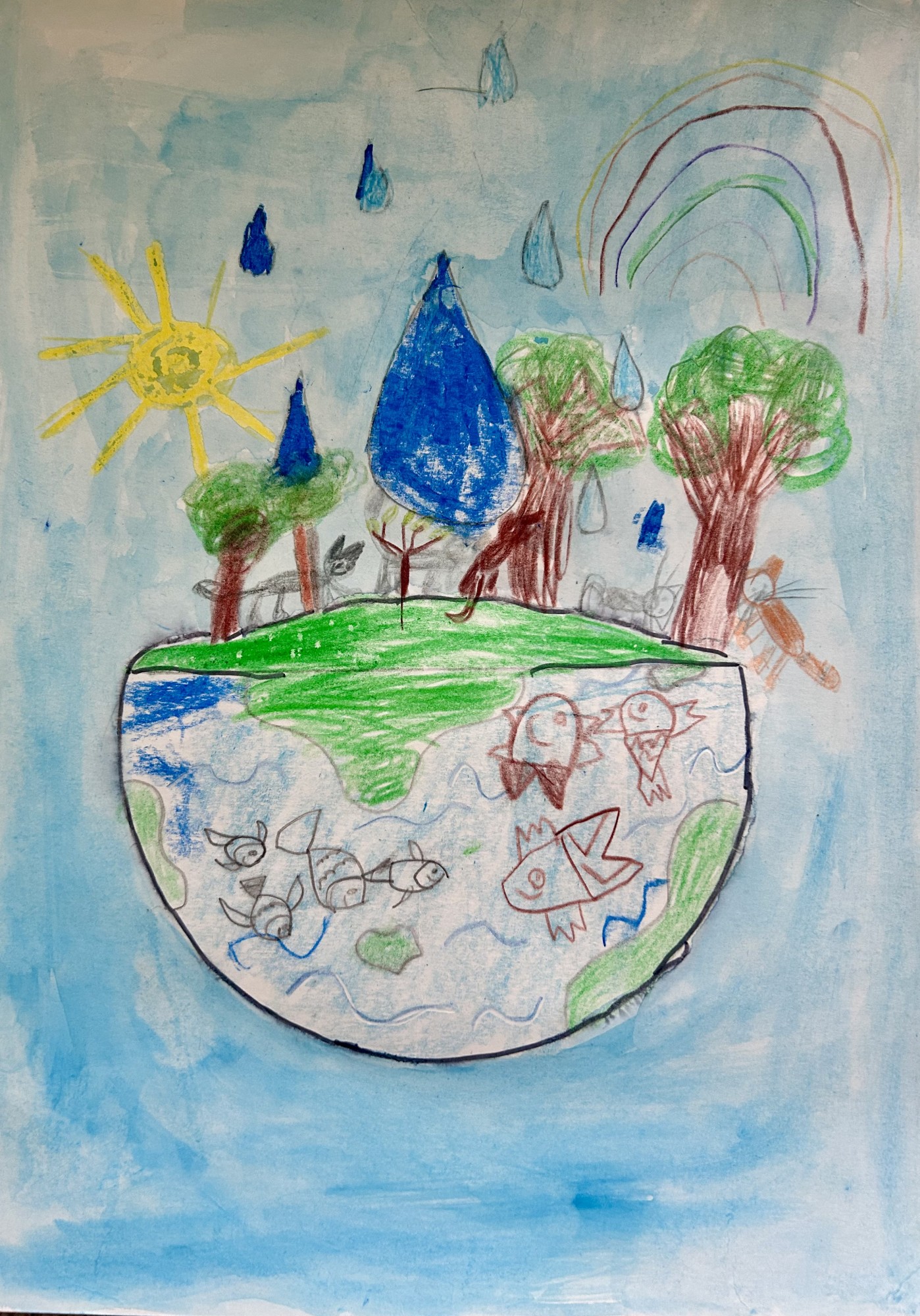 Zīmējums attēlo ūdens ciklu dabā, tā nozīmi un vēsta, ka bez ūdens nav iespējama dzīvība.