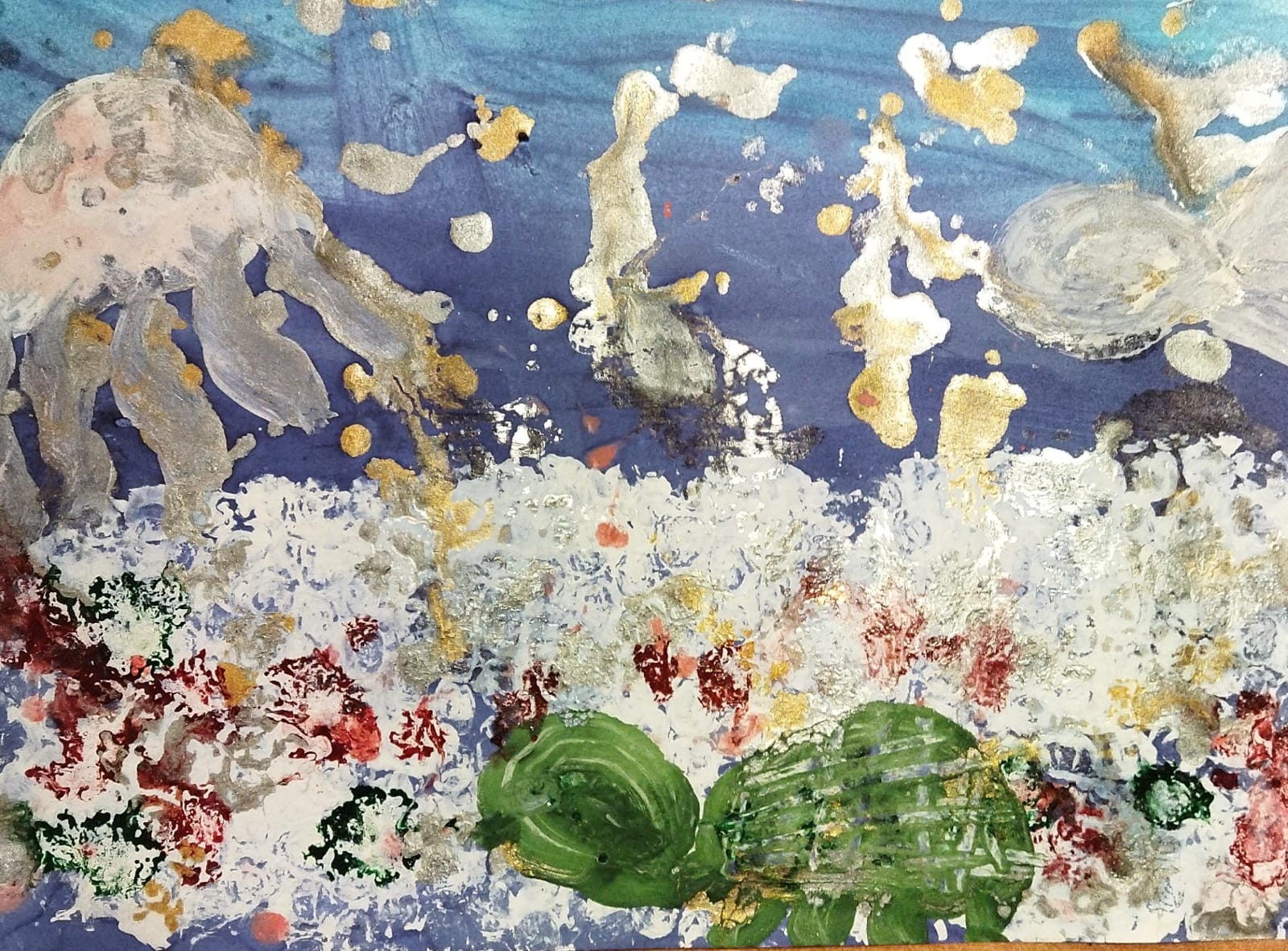 ZĪMĒJUMĀ IZMANTOTAS GUAŠAS MARMORĒŠANAS KRĀSAS, BURBUĻPLĒVES NOSPIEDUMI, KRĀSU PILIENU IZPŪŠANA.
