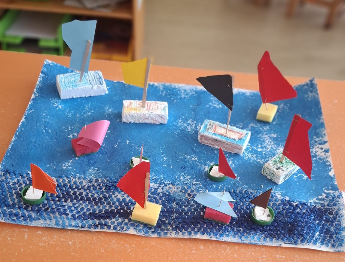 Tākā mēneša tēma ir transports, tad bērni izvēlējās taisīt transporu, kurš pārvietojas ūdenī -kuģīšus no dažādiem materiāliem, kurus var arī peldināt, to arī pēc darba paveikšanas darījām ar lielu sajūsmu un prieku.
