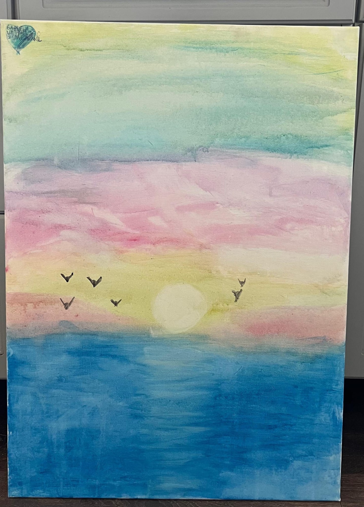 Gabriela brīvajā laikā ļoti aizraujas ar mākslu, no sirds veido ļoti skaistus darbus, vienmēr pievēršot lielu uzmanību uz detaļām, bez vecāku un pedagogu iesaistes viņai top ļoti brīnišķīgi zīmējumi un darbiņi, kas liek priecāties par viņas talantu. Un ar akvareļu krāsām viņai ir tapis šis skaistais saulriets uz ūdens.
