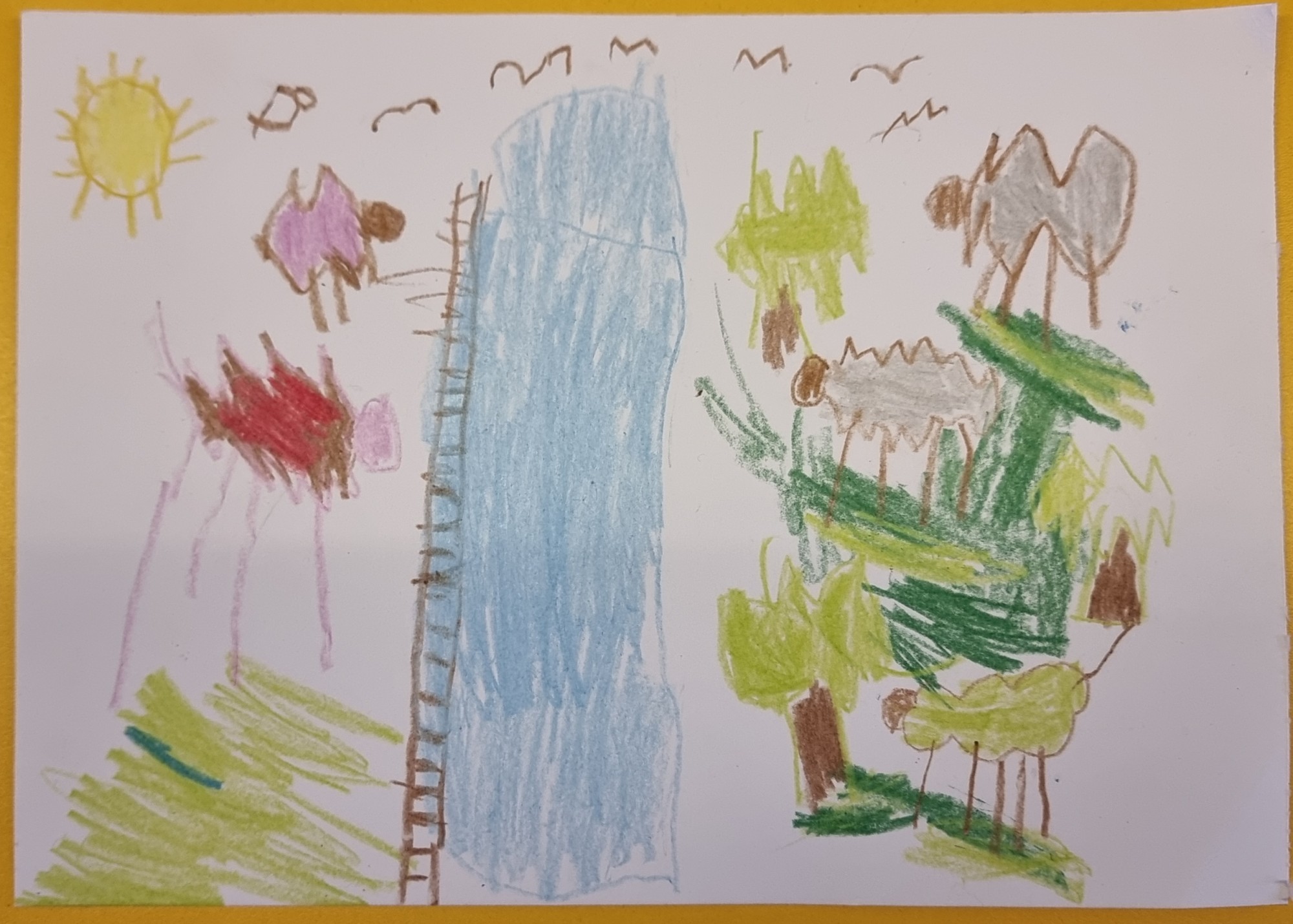 Manam tētim ir aitu saimniecība un es uzzīmēju kā aitas ganās pie ūdenstorņa. Divas aitas ir nepaklausīgas un mēģina uzrāpties pa ūdenstorņa trepēm pēc ūdens. Citām aitām ir mazi jēriņši, kuri arī dzer tīru un veselīgu ūdeni.