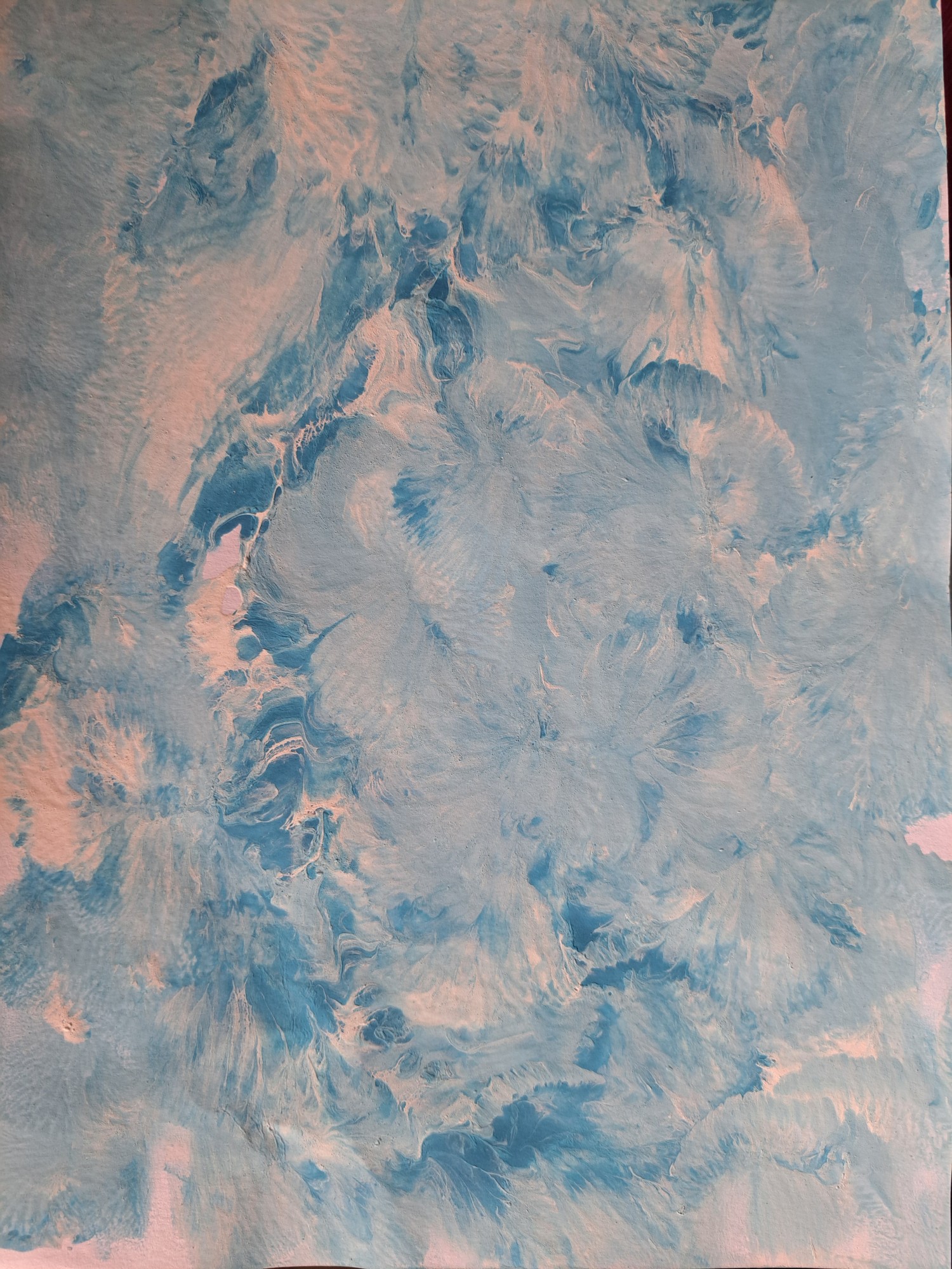 Zīmējums tapis, kad ar piepūstu balonu tika izcilāta baltā un zilā guaša krāsa. Nospiedumi atgādina medūzas jūrā.