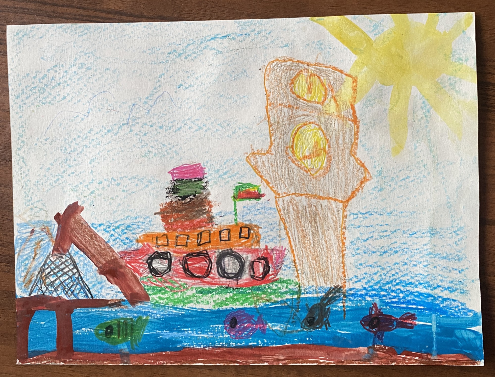 Kuģis jūrā sazvejoja daudz zivju. Te ir labs un tīrs ūdens. Tas zivīm patīk un tāpēc tās ir priecīgas. Labi var to novērot no bākas.