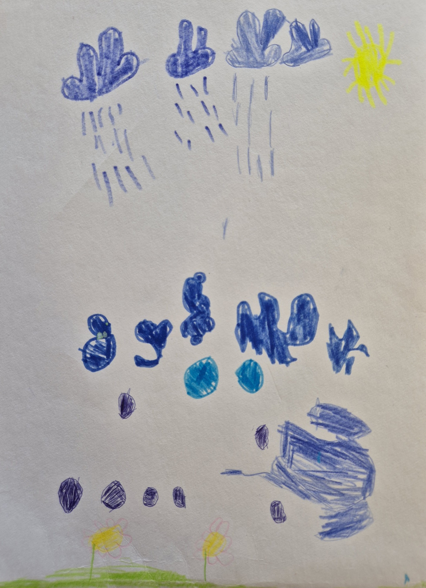 Zimēts ar flomāsteriem. Attēlots lietus un peļķes.